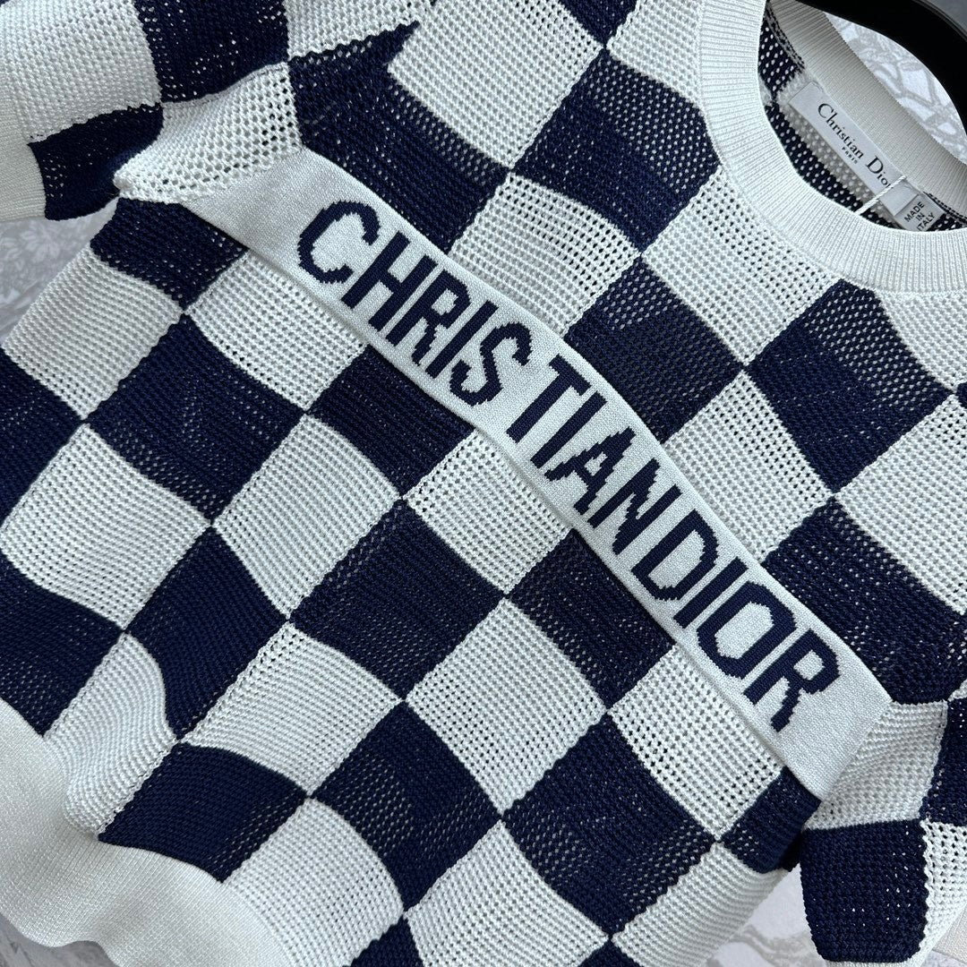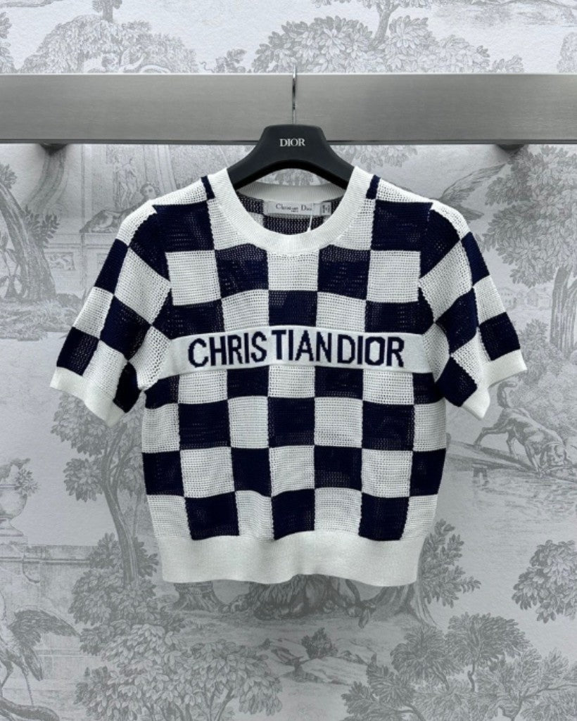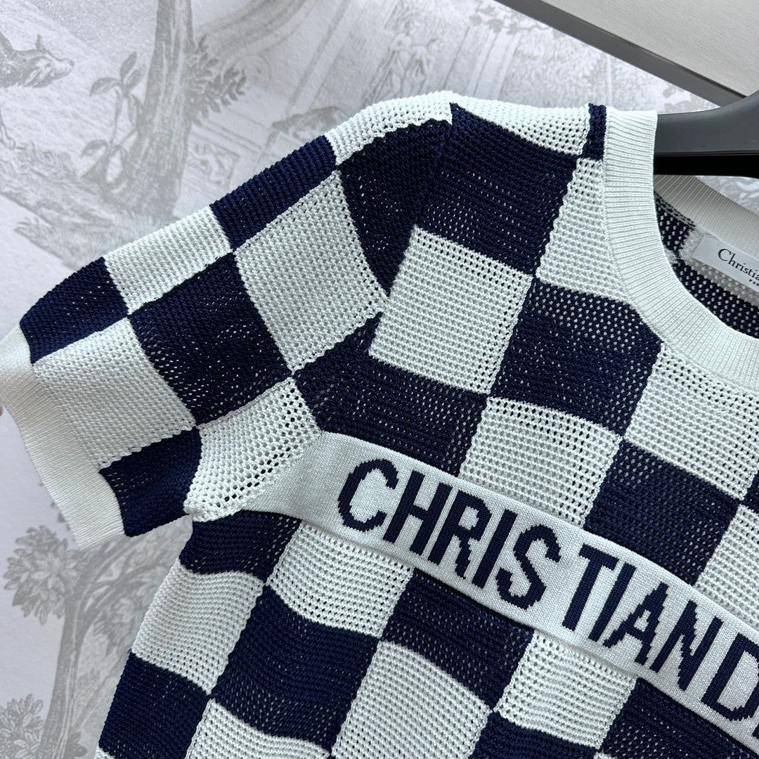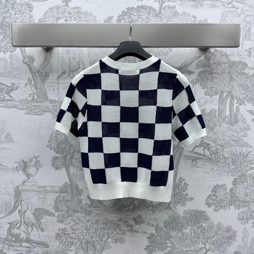 Hohlgestricktes kariertes Oberteil, importiertes 100 % Wollmaterial, gestricktes kurzärmeliges Oberteil, Hohlstrickstruktur, gehäkelte Buchstabenlogo-Verzierung auf der Brust, insgesamt hochwertig und schlicht, die Stoffaccessoires sind mit einem kurzen Rundhalsausschnitt entwickelt, können allein oder übereinander getragen werden, alle Jahreszeiten. Ein einzelnes, kontrollierbares Teil, schlichtes Design, modisch und hochwertig