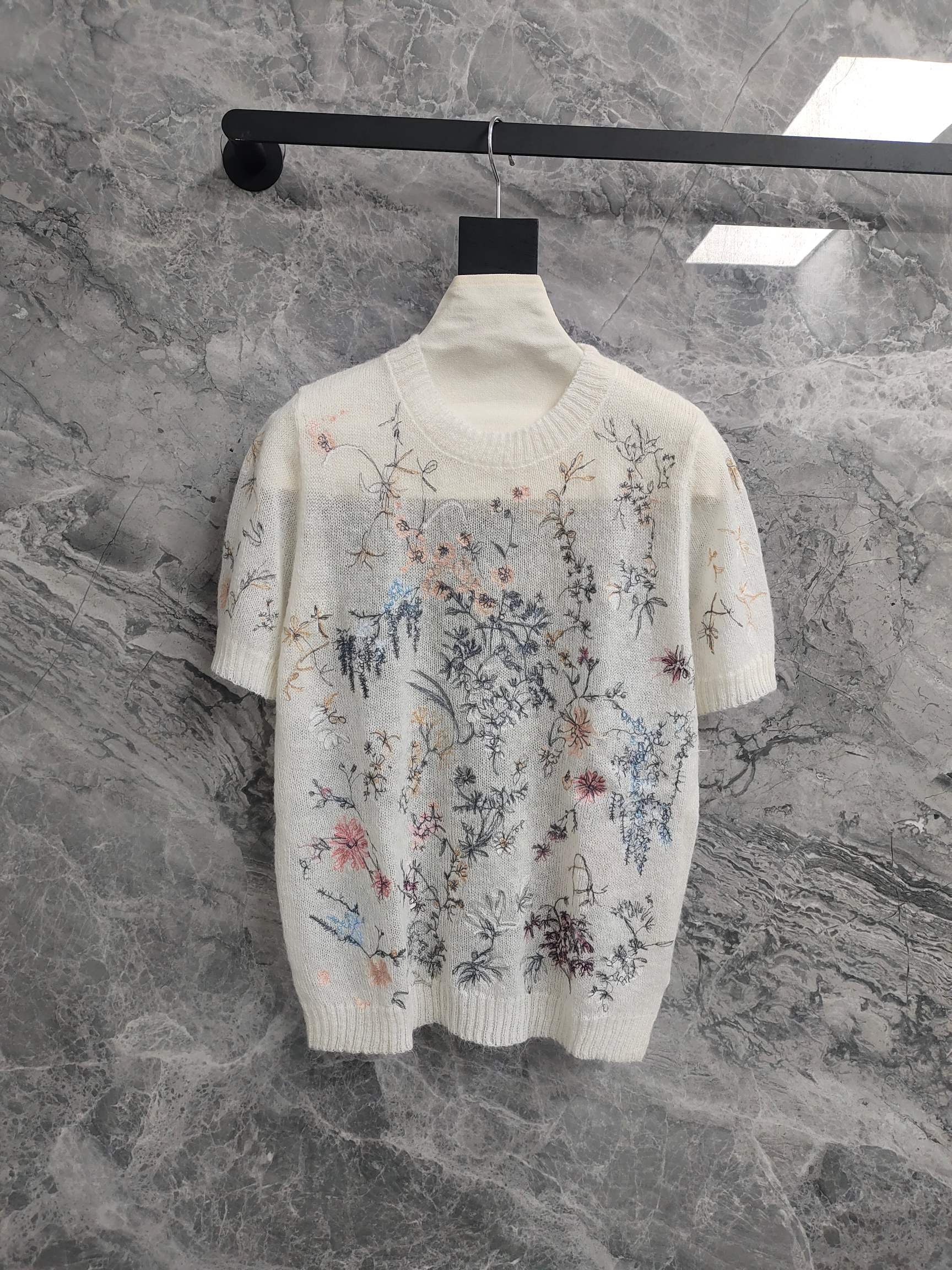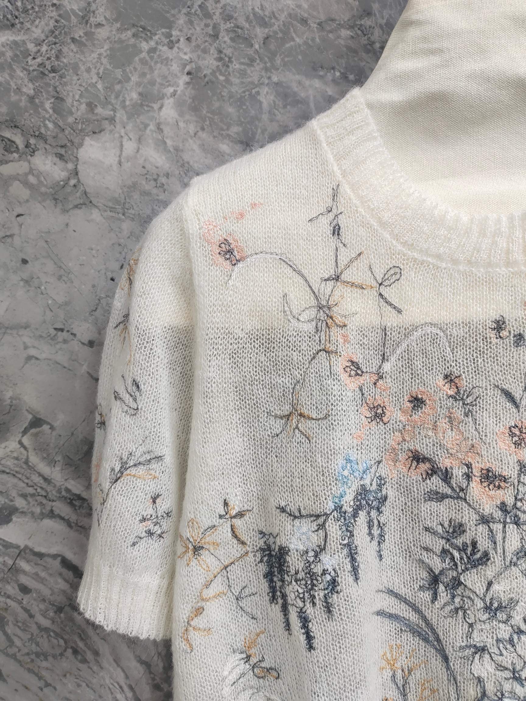 Dieser weiße Kurzarmpullover von D wirkt wie ein bewegendes Frühlingsgemälde. Die zarte Stickerei umreißt farbenfrohe Blumen, manche zart, manche elegant, die frei auf dem Pullover blühen. Die sanften Töne sind miteinander verwoben und vermitteln Romantik und Eleganz. Ihn zu tragen ist, als würde man den ganzen Garten auf seinen Schultern tragen und im geschäftigen Treiben der Welt ein poetisches Gefühl bewahren.