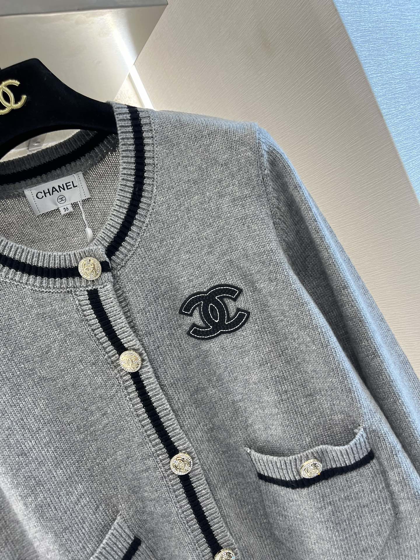 Aus Wollgarn gewebt, weich und bequem, stilvoll und schlank machend. Rundhals-Cardigan-Schnitt, verziert mit Saumstreifen. Wählen Sie die klassische Farbkombination aus Schwarz und Grau, voller Exquisitheit. Gehäkelte Logo-Stickerei auf der Brust, mit symmetrischem Taschendesign, zeigt temperamentvollen College-Stil und verleiht dem Oberkörper eine jugendliche Atmosphäre, perfekt für den Lagenlook im Herbst und Winter