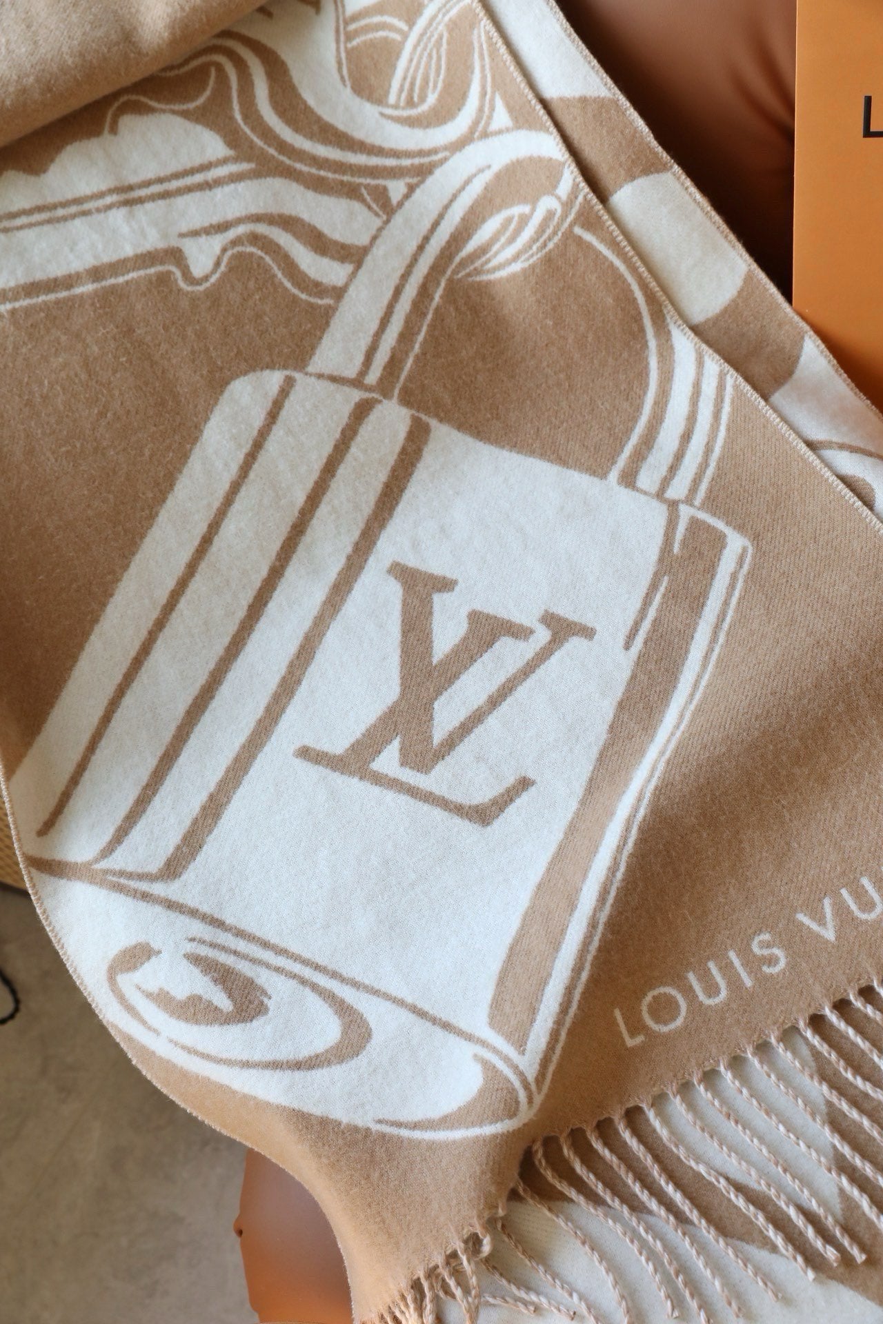 Der Schal besteht aus einem kuscheligen, plüschigen Mischgewebe und hat auf der einen Seite ein Vorhängeschloss- und Schlüsselmuster, das sich in ein Medaillon verwandelt – eine spielerische Reminiszenz an die Tradition der Marke in der Schachtelherstellung.