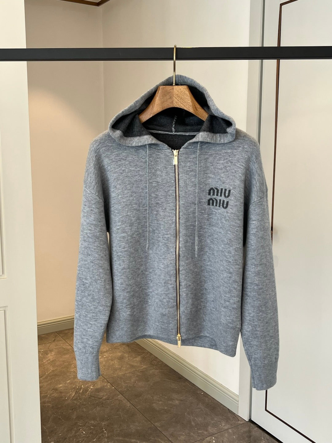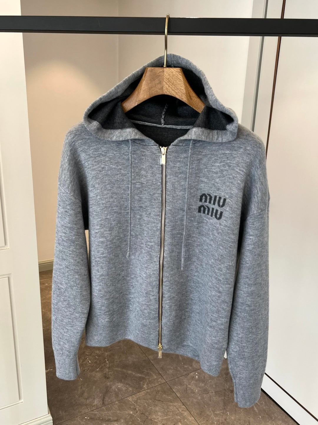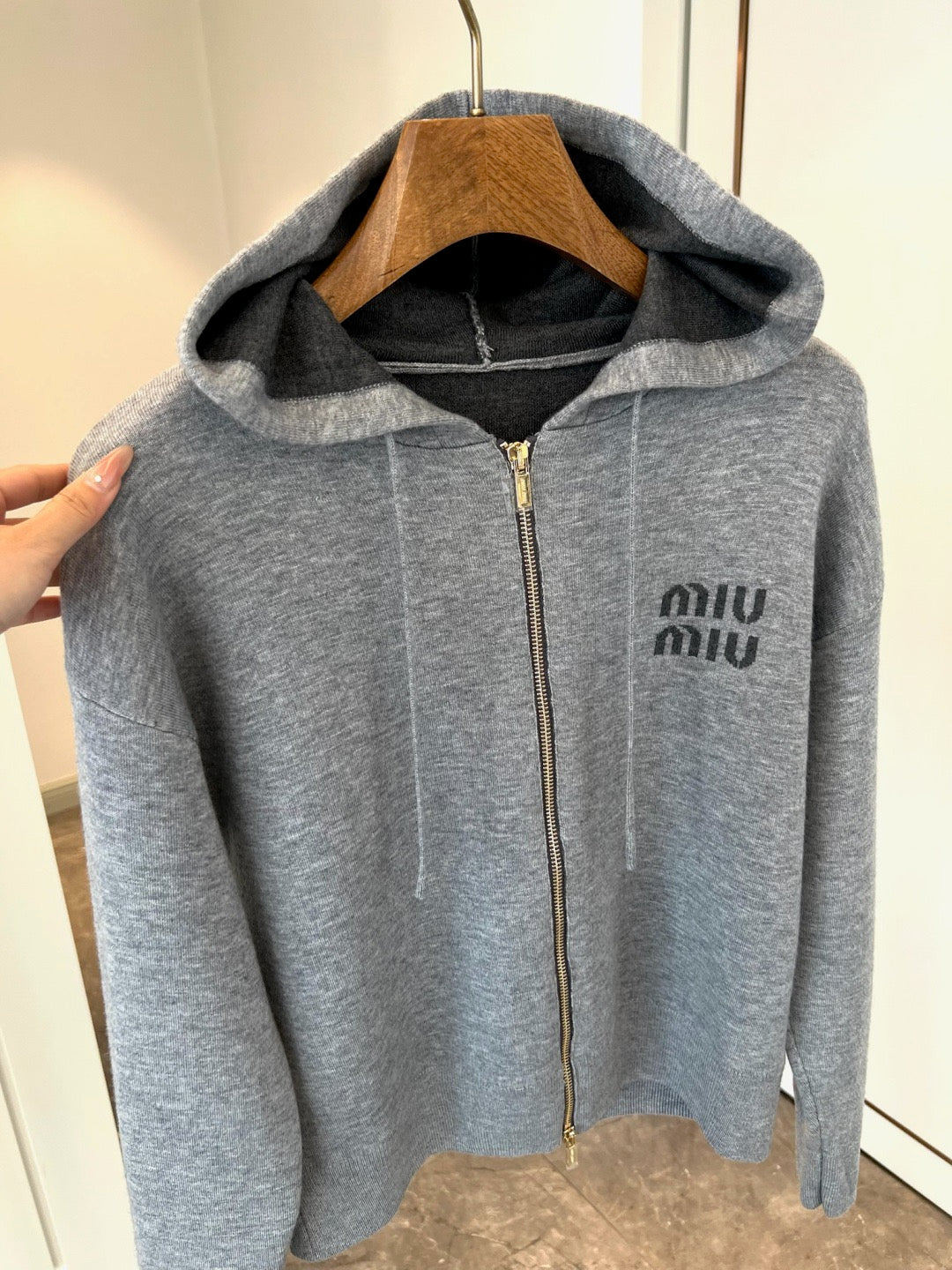 100 % Wolle. Neuer Doppelstrick-Cardigan mit Kapuze und Reißverschluss (2025). Dieser ikonische Reißverschluss-Cardigan wurde in Doppelstrickwolle neu interpretiert und mit dem Miu-Intarsien-Logo verziert, das seinen modernen, lässigen Touch unterstreicht. Perfekt für die Saison: Dieser Kapuzenpulloverschnitt nutzt Stricktechniken für einen entspannten, relaxten Look. Blumenschriftzüge auf der Brust und der Doppelreißverschluss sorgen für einen schlichten und dennoch stilvollen Look. Die klare, stromlinienförmige Silhouette schmeichelt und ist vielseitig. Das Doppelreißverschluss-Design bietet vielseitige Styling-Optionen!