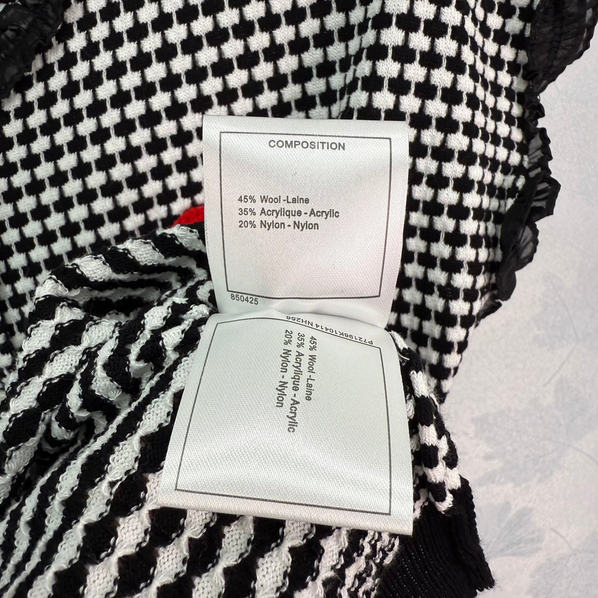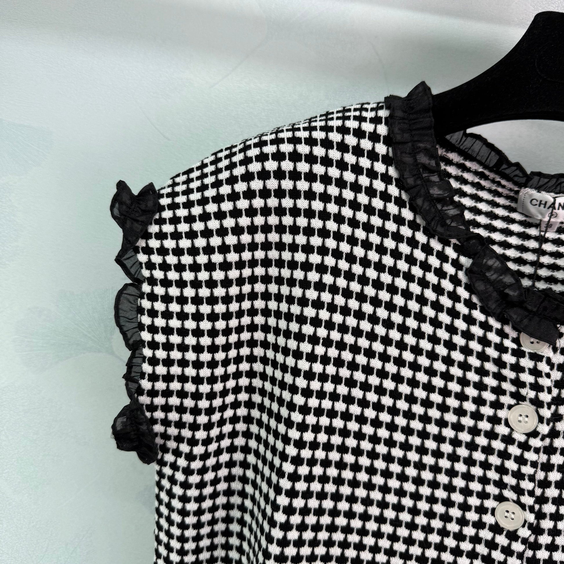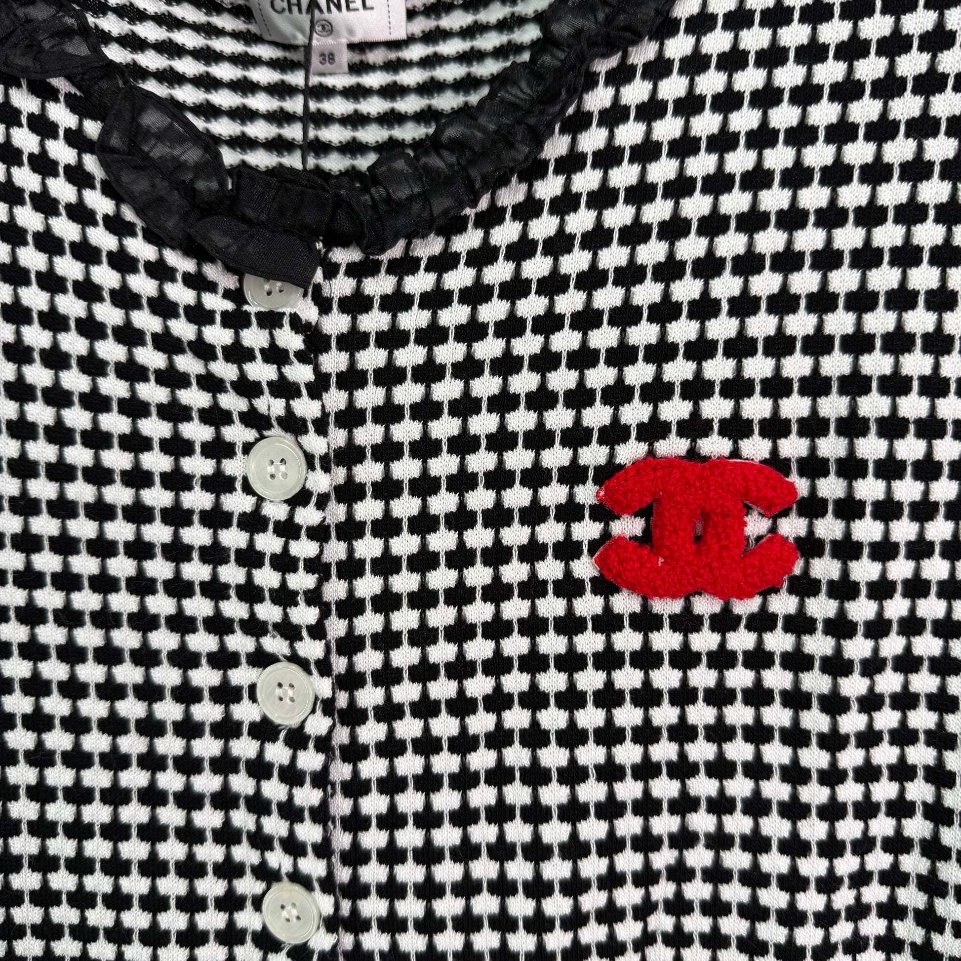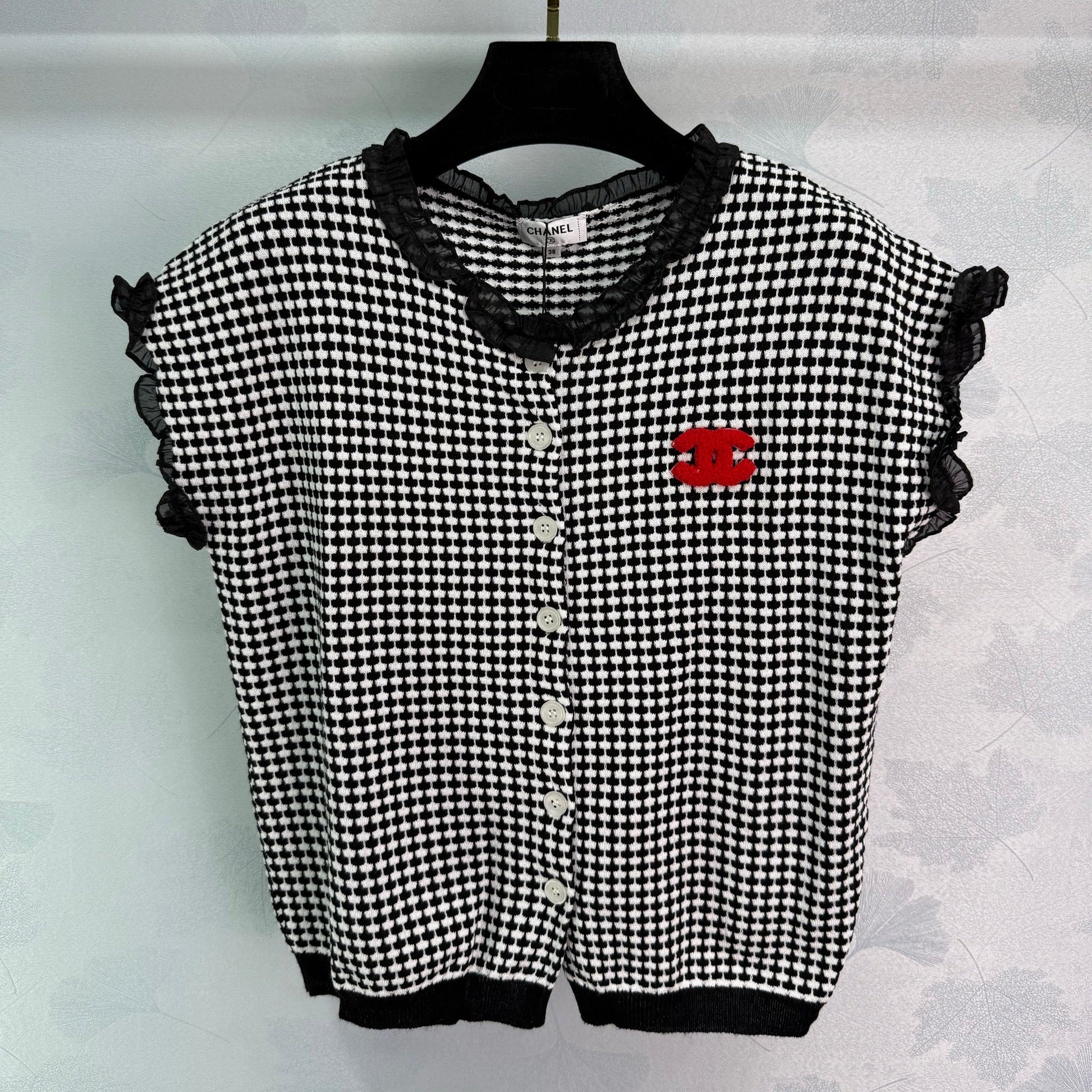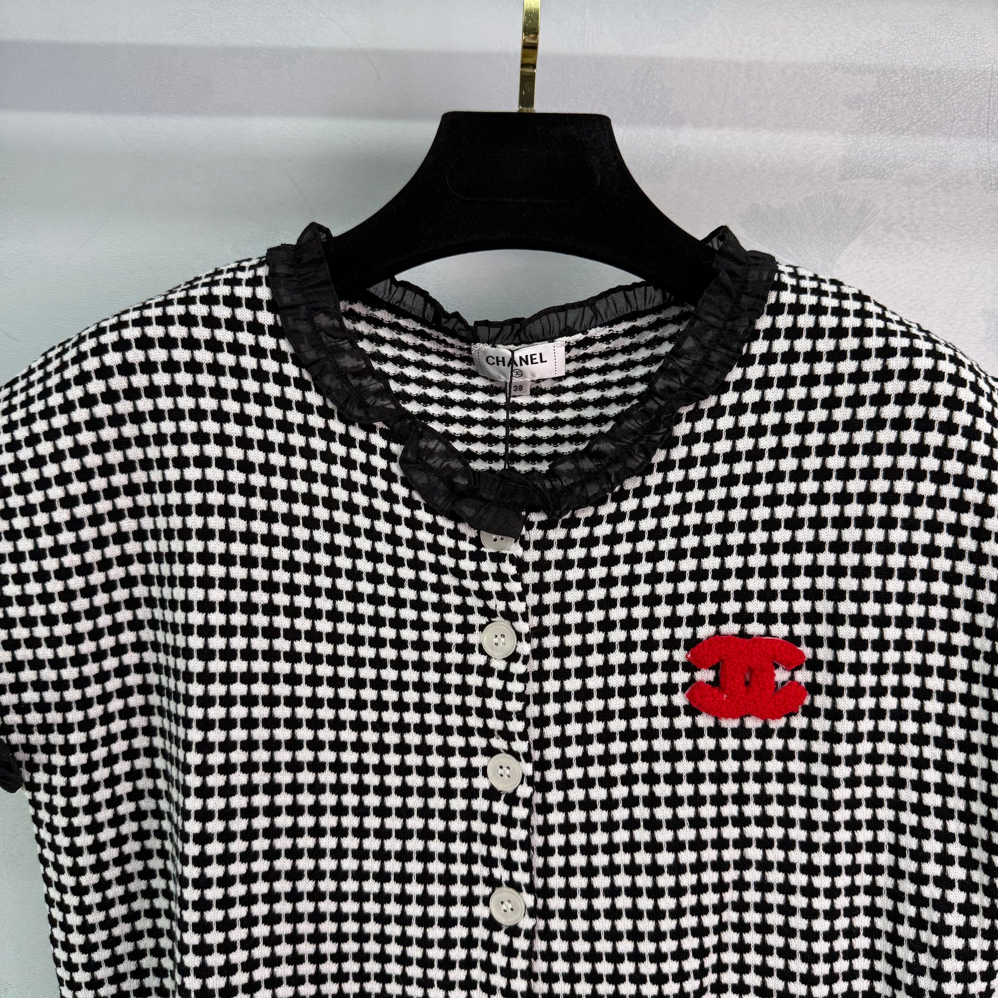 Chanel*2025 Frühling/Sommer, neue Hahnentritt-Strickjacke mit kurzen Ärmeln, klassisches Schwarz-Weiß-Karomuster mit schwarzer Spitze, rote Doppel-C-Stickerei auf der Brust, exquisit und großzügig, hochwertiger, modischer Damenstil mit Temperament, Größe S