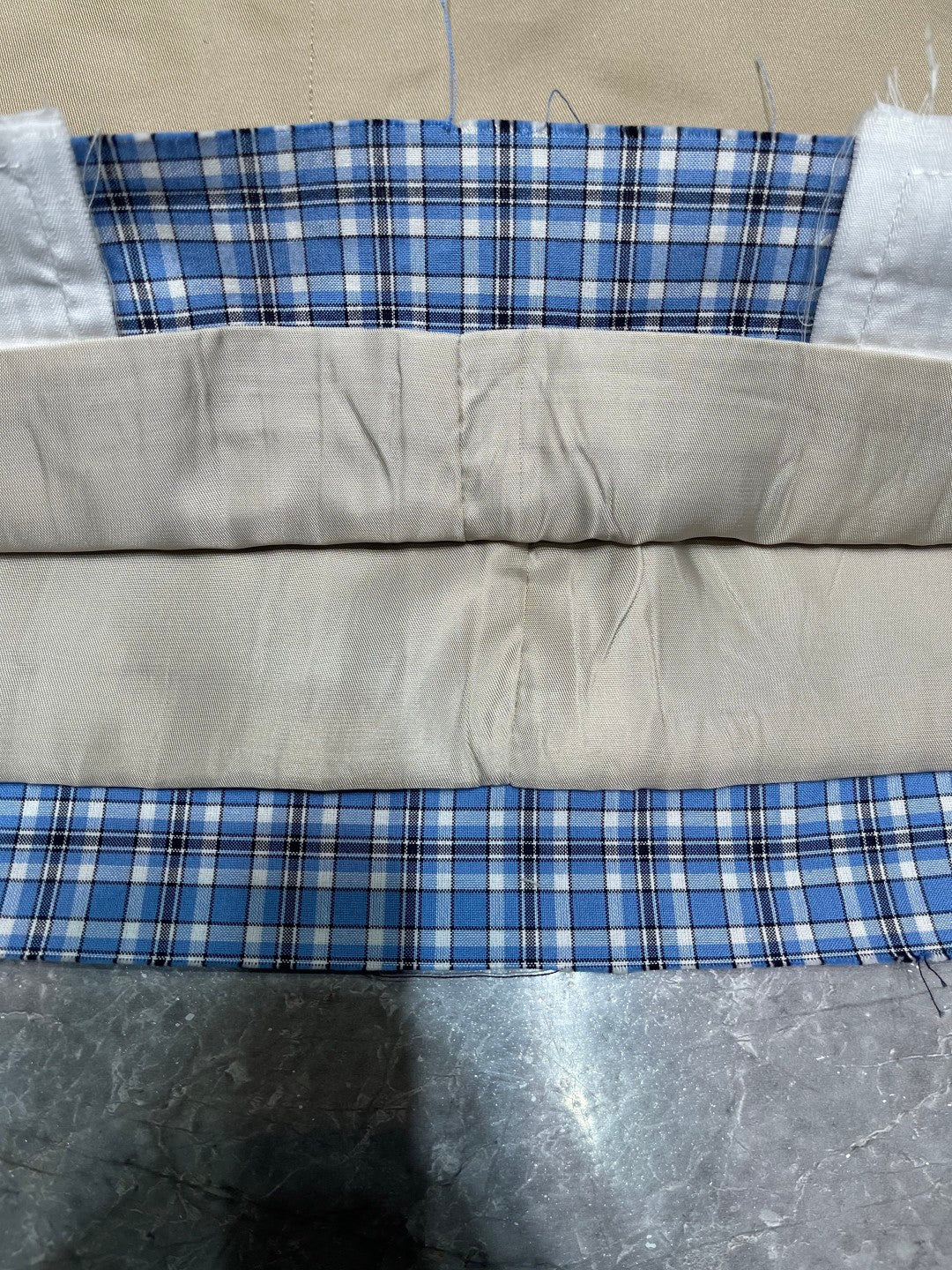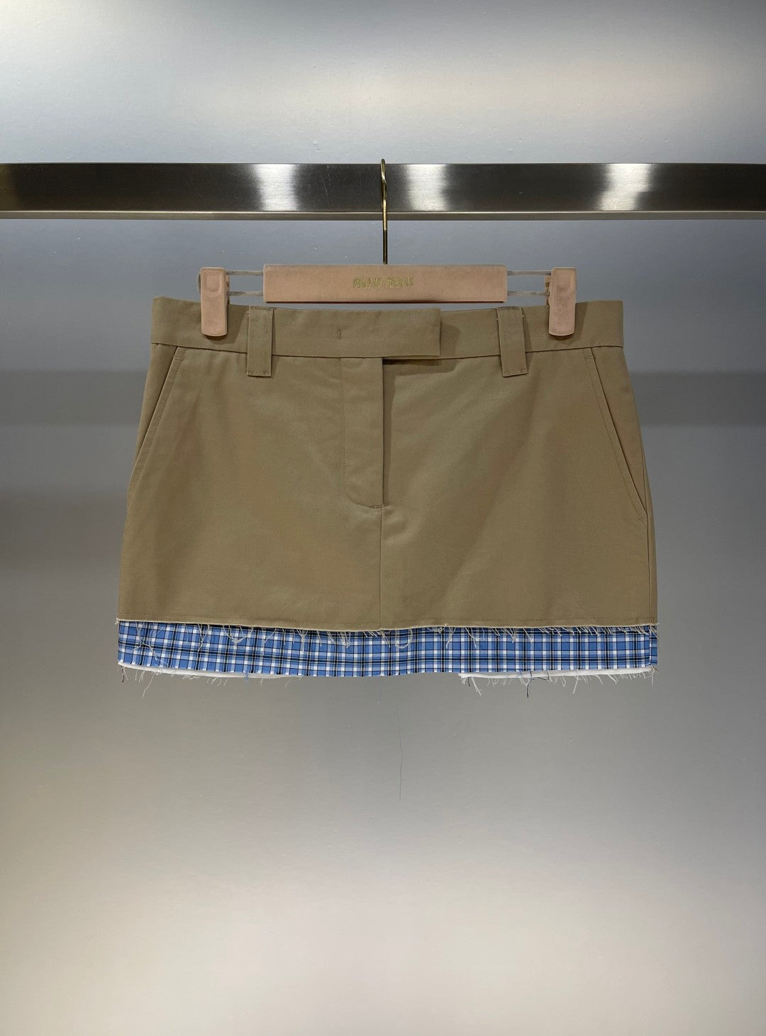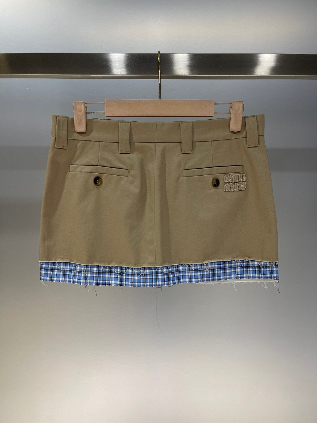 Dieser khakifarbene Minirock besticht durch sein verspieltes Lagendesign – der Saum ist mit blau kariertem Stoff besetzt, und die ausgefransten Kanten verleihen ihm einen coolen, kantigen Look. Er hat Gesäßtaschen und ein kleines gesticktes Logo auf einer Seite setzt ein dezentes Detail.