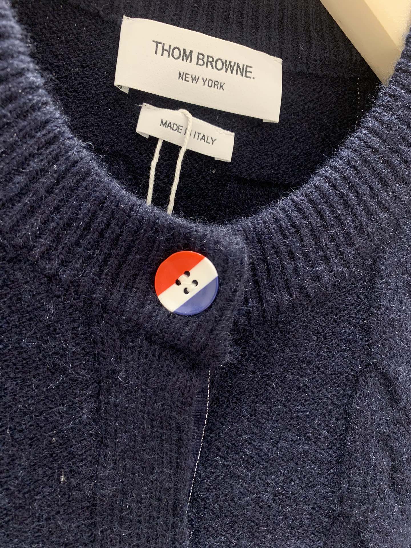 Gestrickte Strickjacke mit Rundhalsausschnitt in Kontrastfarbe 🆕 Streifenmuster in Kontrastfarbe Zwei mit Logoknöpfen verzierte Taschen Geflochtenes Kantendesign an Manschetten und Kragen Modisch und vielseitig Größe S/M