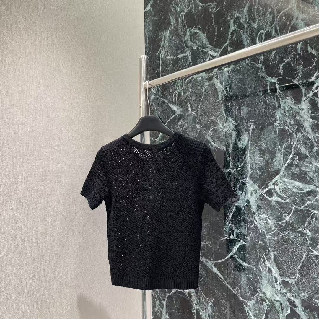 25 neue Sommerstile. Gestrickte, hohle, kurze Ärmel. Ausgehöhlt und leicht transparent. Das halboffene, sorgfältige Design vorne in Gold + das Doppel-C-Hardware-Nagel-Diamant-Logo hebt die Highlights hervor und zeigt den Markenton. Der vielseitige Stil ist nicht wählerisch in Bezug auf Alter und Hautfarbe. Der Oberkörper eignet sich für einen modischen Stil, der das Alter reduziert.