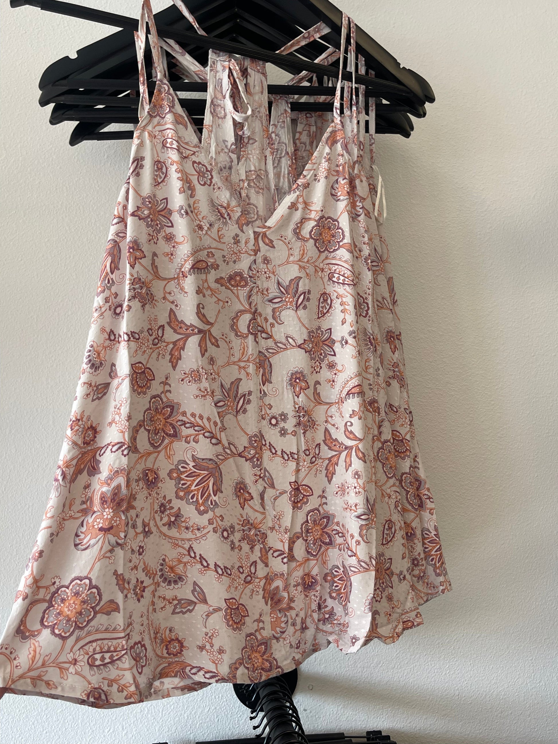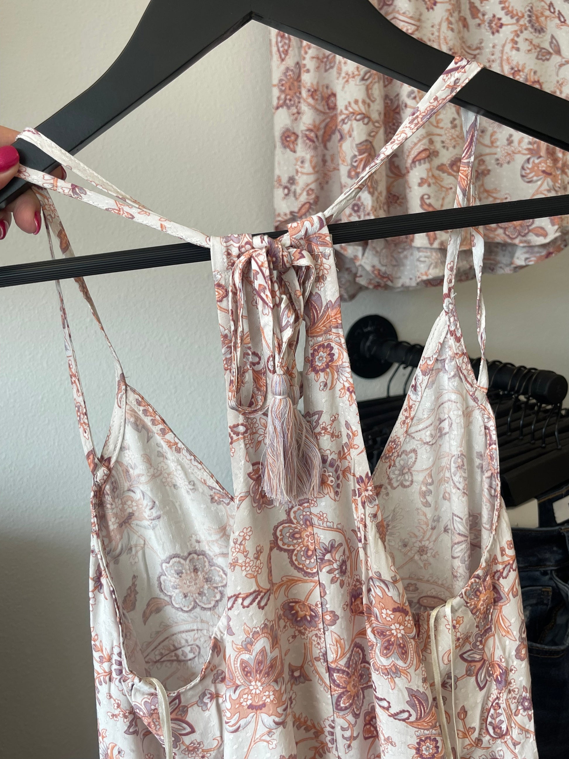 High quality love stitch brand tank with tassel tie. This luxurious tank features a super soft feel, tassels tie in the back and figure flattering shape. The beautiful boho neutral print pairs wonderfully with any outfit. Perfect for summer days or under a cardigan in the colder months.