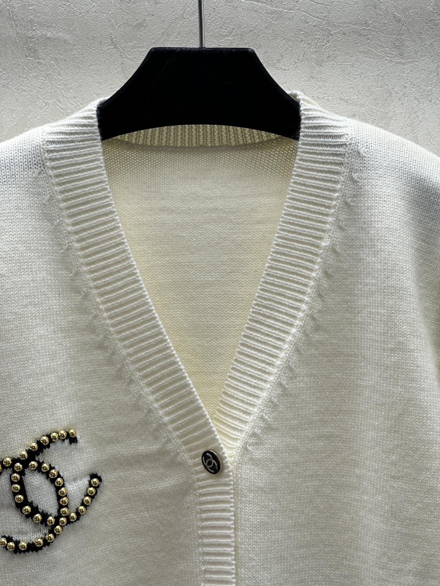 Schlichte, kontrastierende, mit Perlen besetzte Jacquard-Strickjacke mit V-Ausschnitt und langen Ärmeln