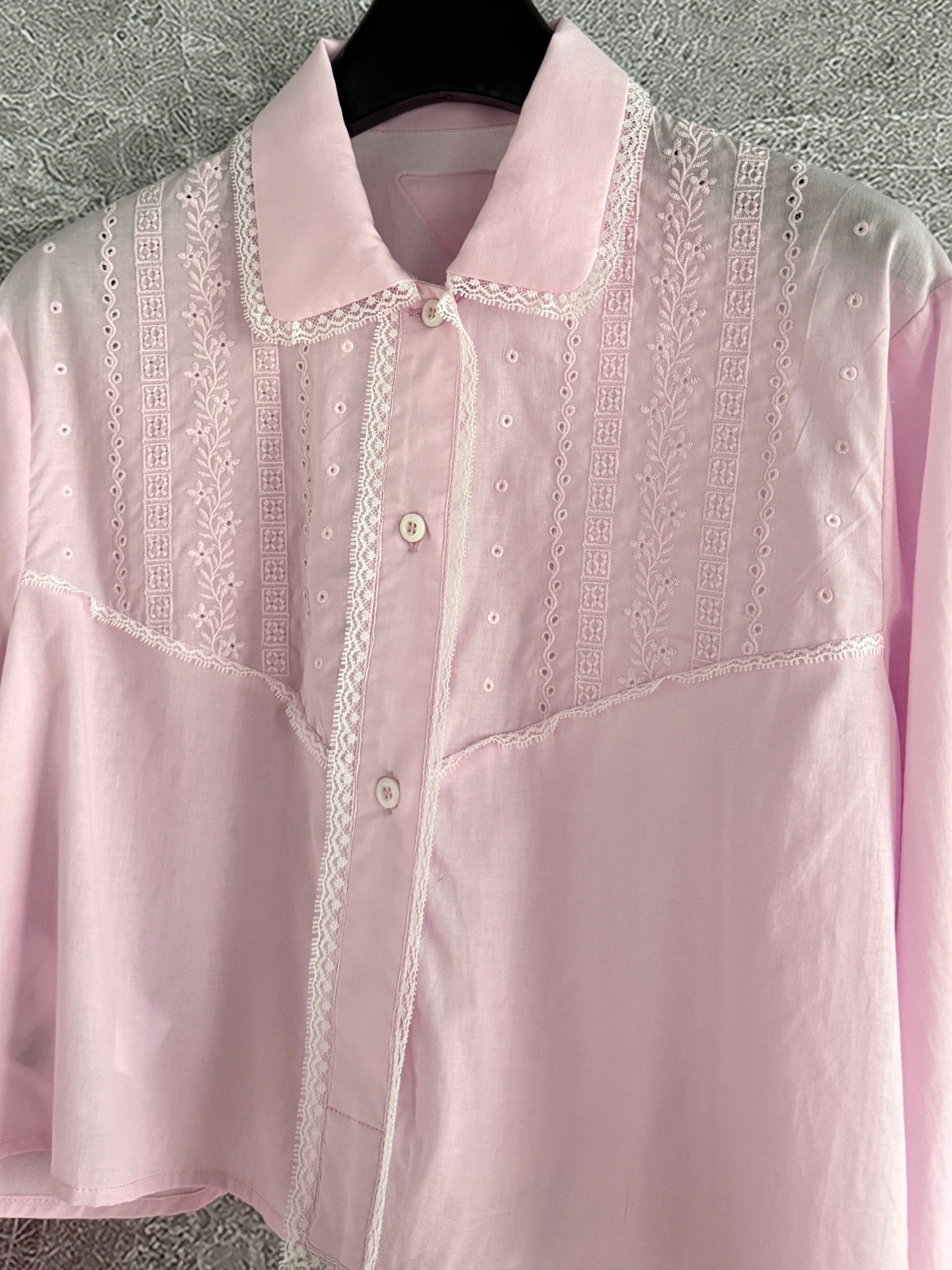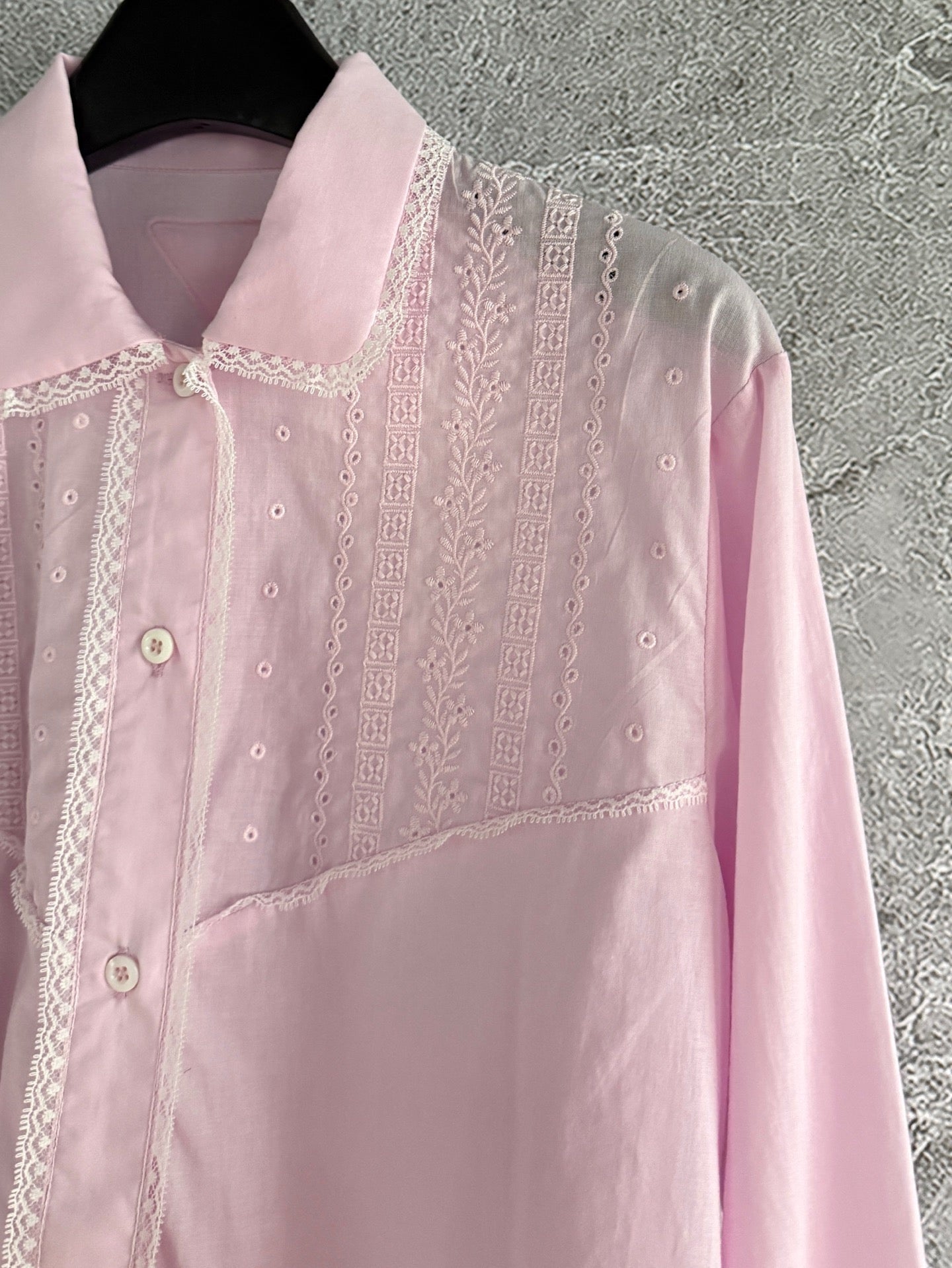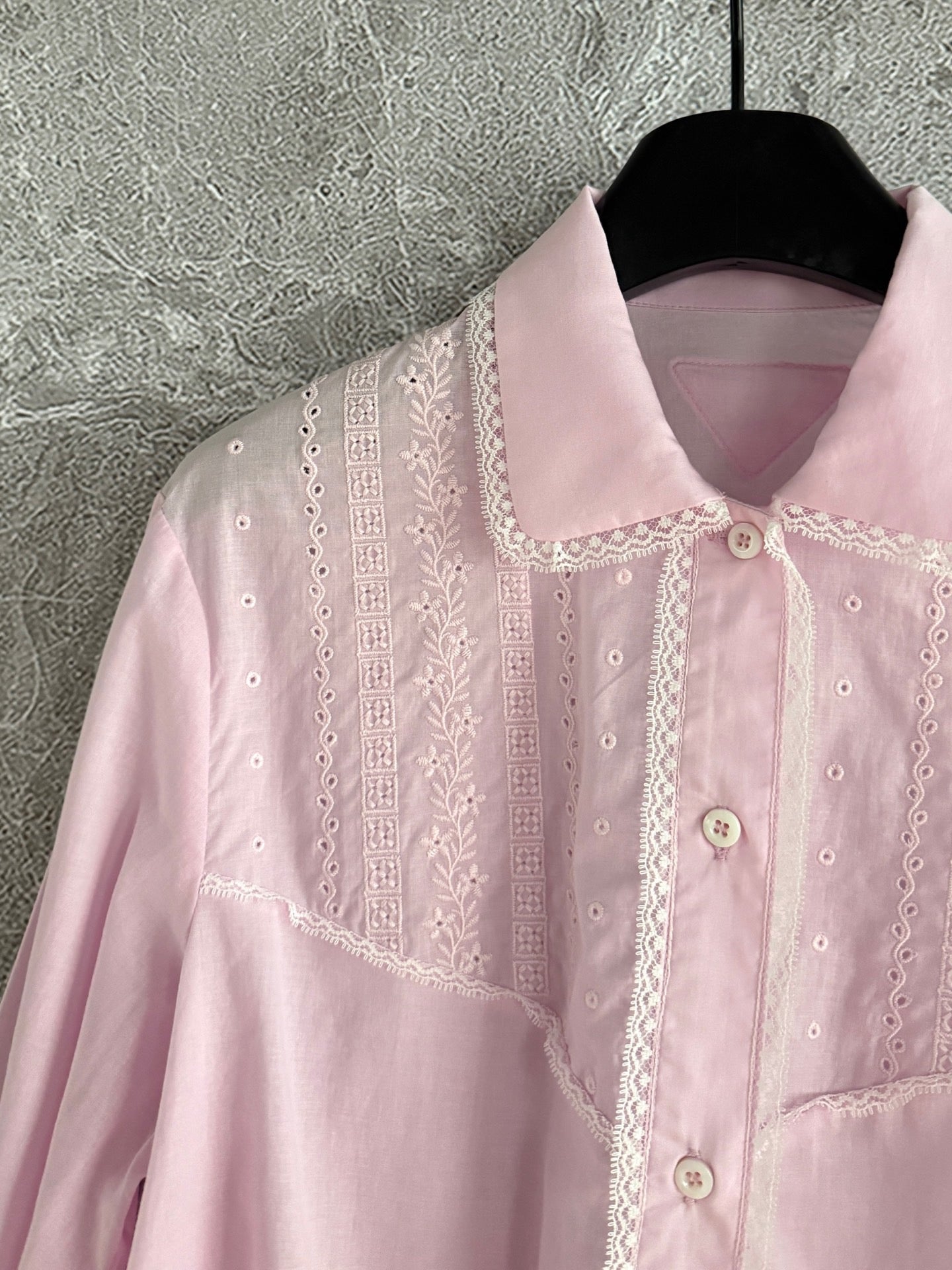 prad*Das rosa bestickte Hemd✨ wirkt beim Tragen sehr märchenhaft, mit feiner Stickerei am ganzen Körper und lebendigen Spitzendetails. Es ist um ein Vielfaches modischer als gewöhnliche Hemden, und die Details vermitteln ein entspanntes Gefühl. Das Material besteht aus sehr dünner und weicher Seidenbaumwolle, die weich und klebrig ist, aber am Oberkörper eine gute Baumwollstruktur aufweist. Dieses Stück ist selbst im heißesten Sommer sehr angenehm zu tragen.