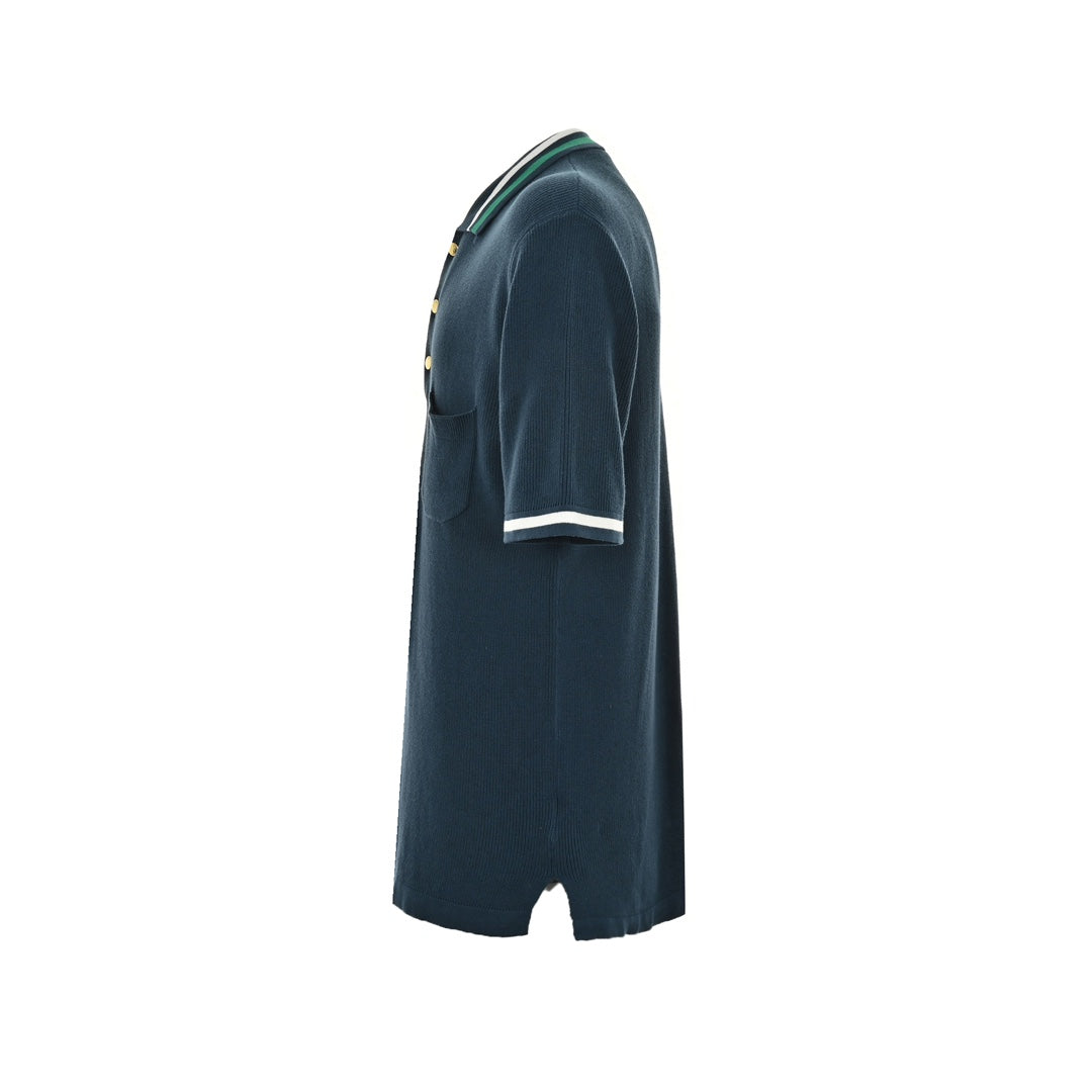 Dieses Modell besteht aus einem dunkelblauen Baumwoll-Woll-Strickgemisch, hat eine Doppel-G-Stickerei, goldfarbene Knöpfe, einen Polokragen, kurze Rippen, aufgesetzte Taschen, gestreifte Ripppaspeln und eine Knopfleiste.