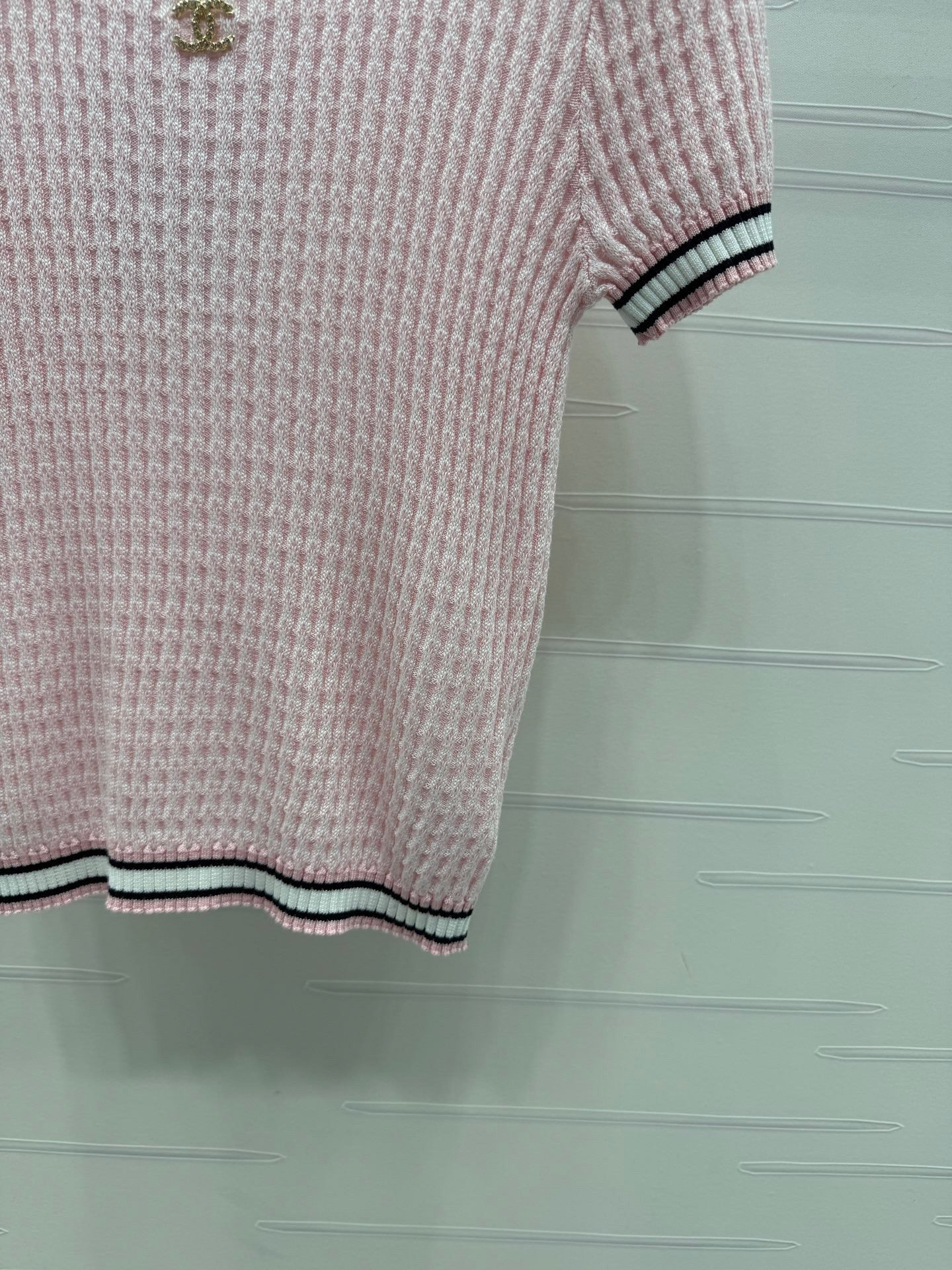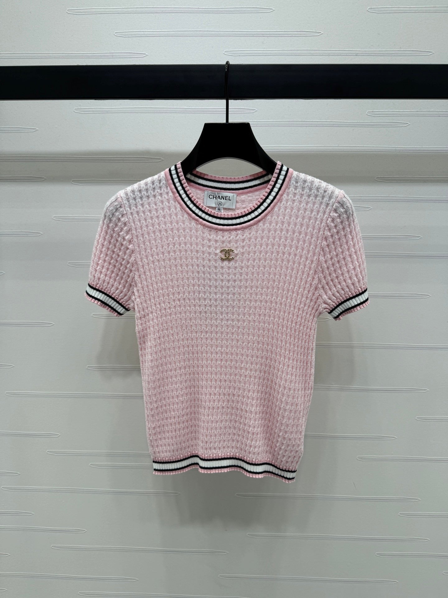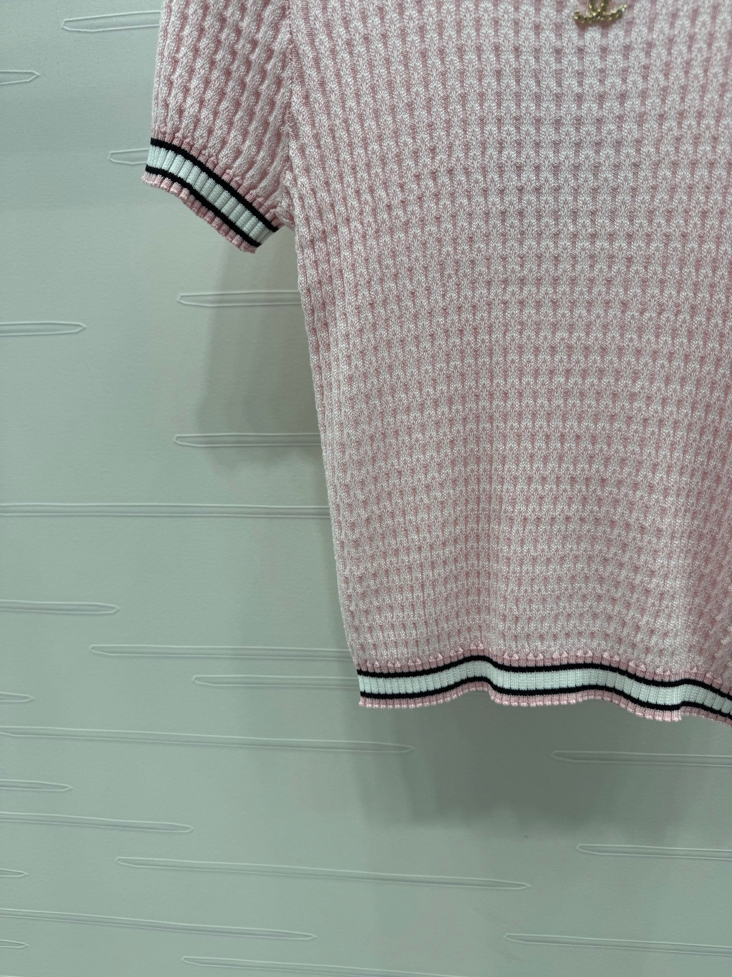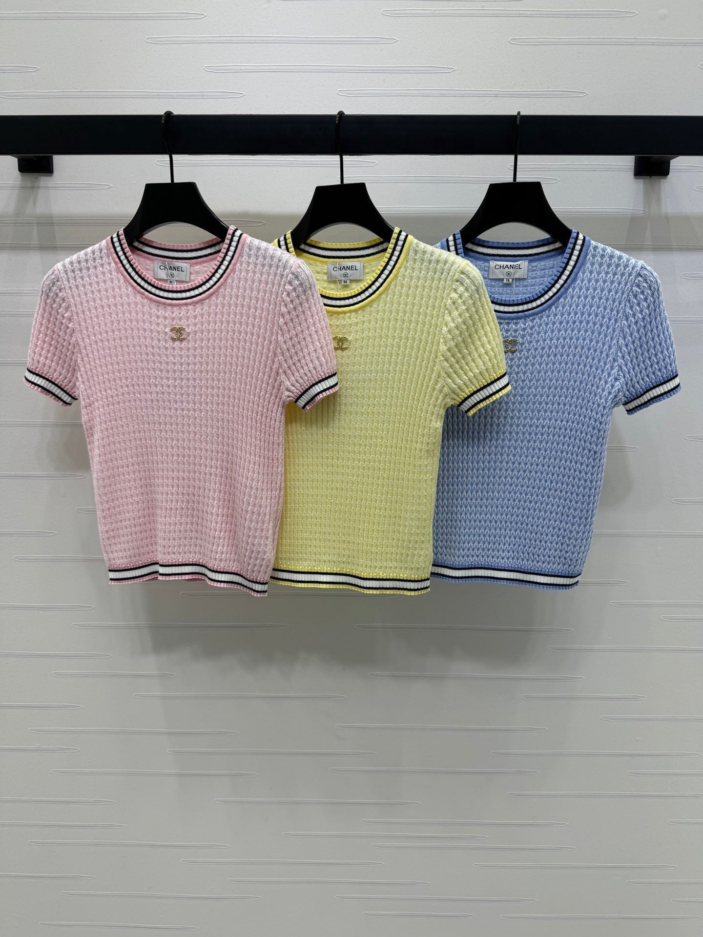 CHANE* 20250525, neueste Frühjahrs- und Sommerkollektion! Rundhalsausschnitt, schmal geschnitten, kurze Strickärmel! Individuell gestricktes Material, zarte Textur, weich und bequem. Rundhalsausschnitt, kurze Strickärmel sind am gesamten Körper mit Häkeltexturen geschnitten, um das gerippte Texturmuster hervorzuheben und das hochwertige Tragegefühl hervorzuheben. Kontrastierende Fadenbesätze an Halsausschnitt, Bündchen und Saum. Passt sich durch seine elastischen Eigenschaften der Körperform an und lässt Sie schlanker aussehen. Doppel-C-Logo-Verzierung auf der Brust verleiht einen exquisiten Ton. Zeigt den Markenton. Vielseitiger Stil wählt weder Alter noch Hautfarbe! 3️⃣ Farben! SML