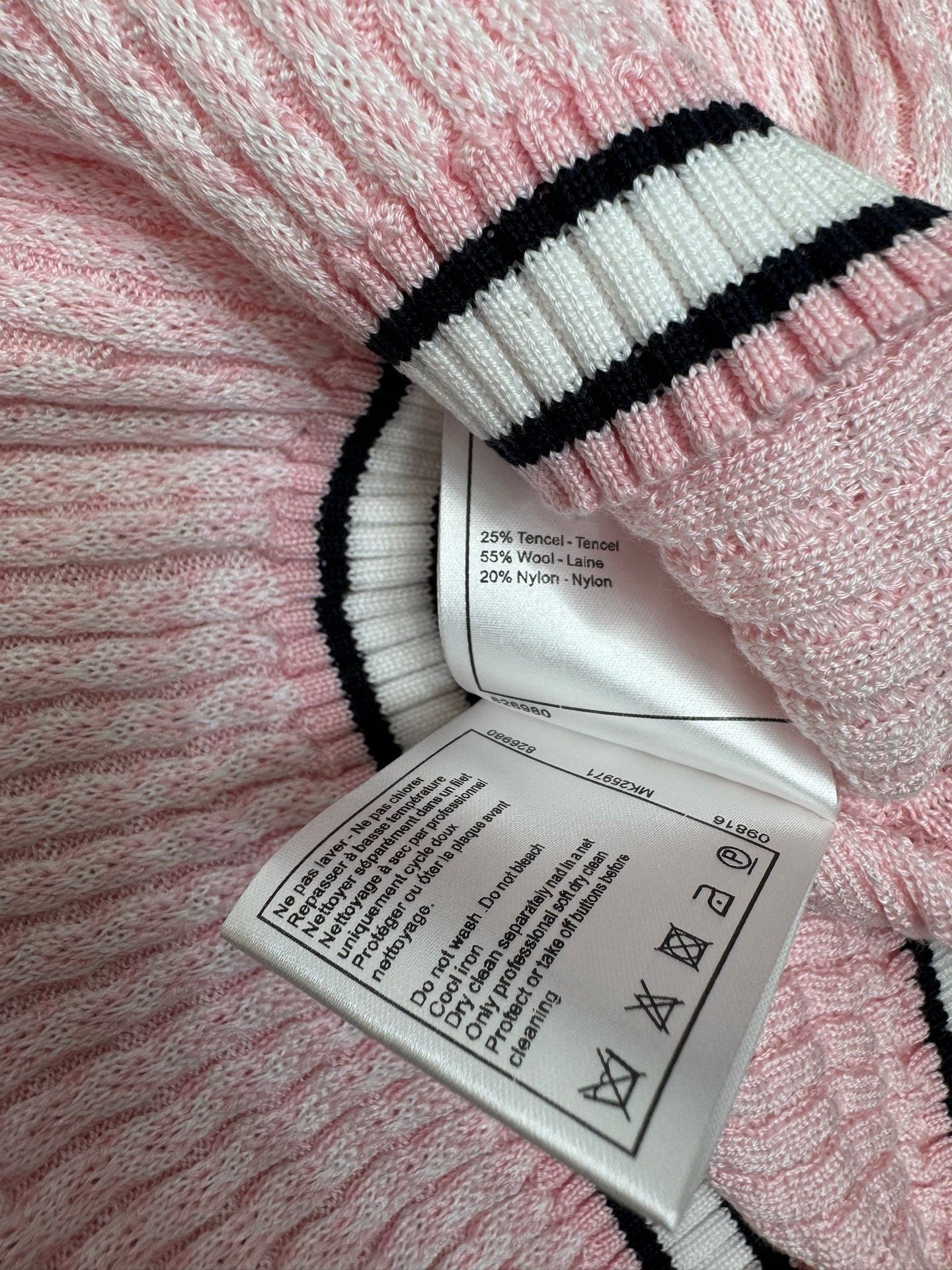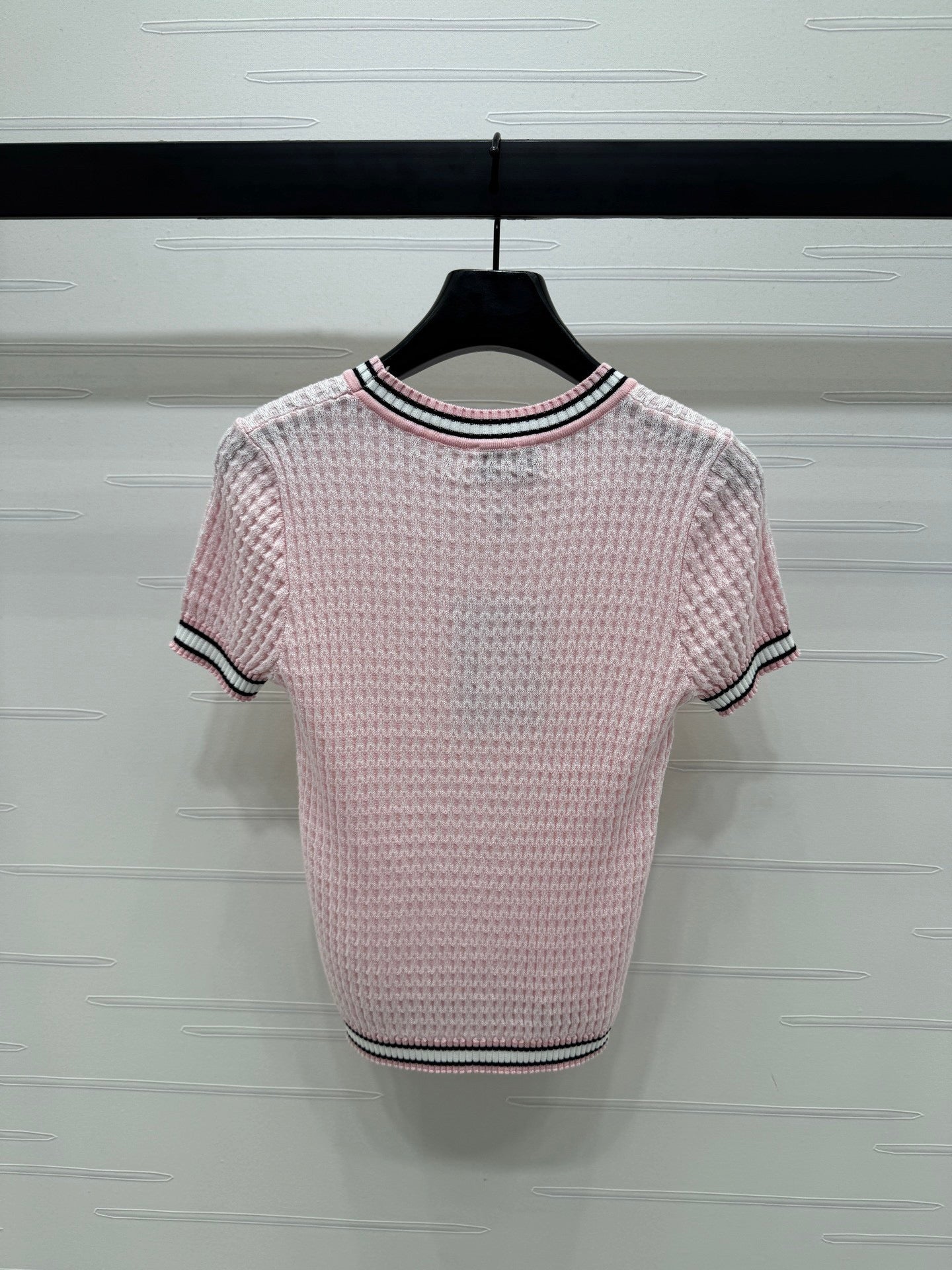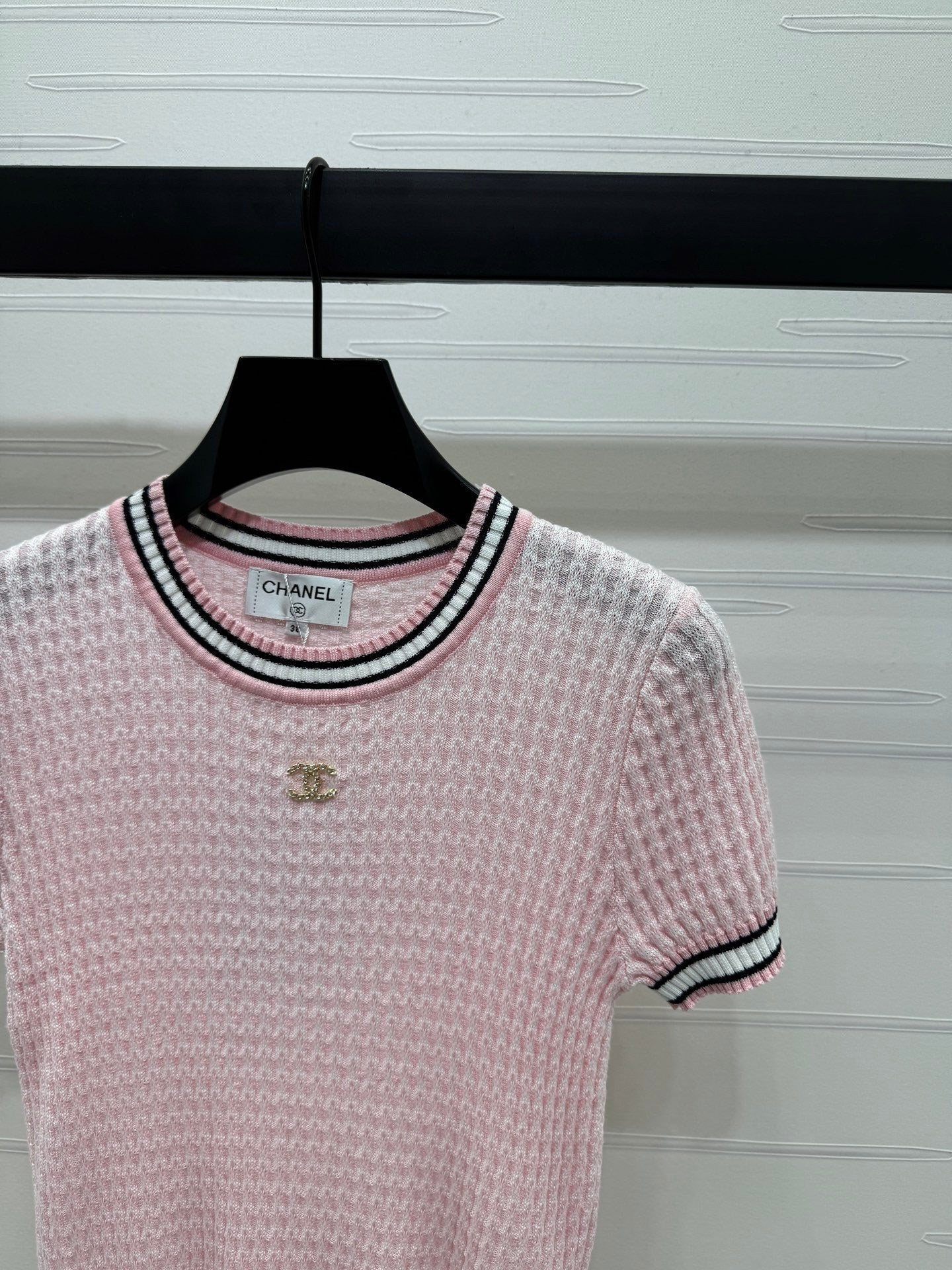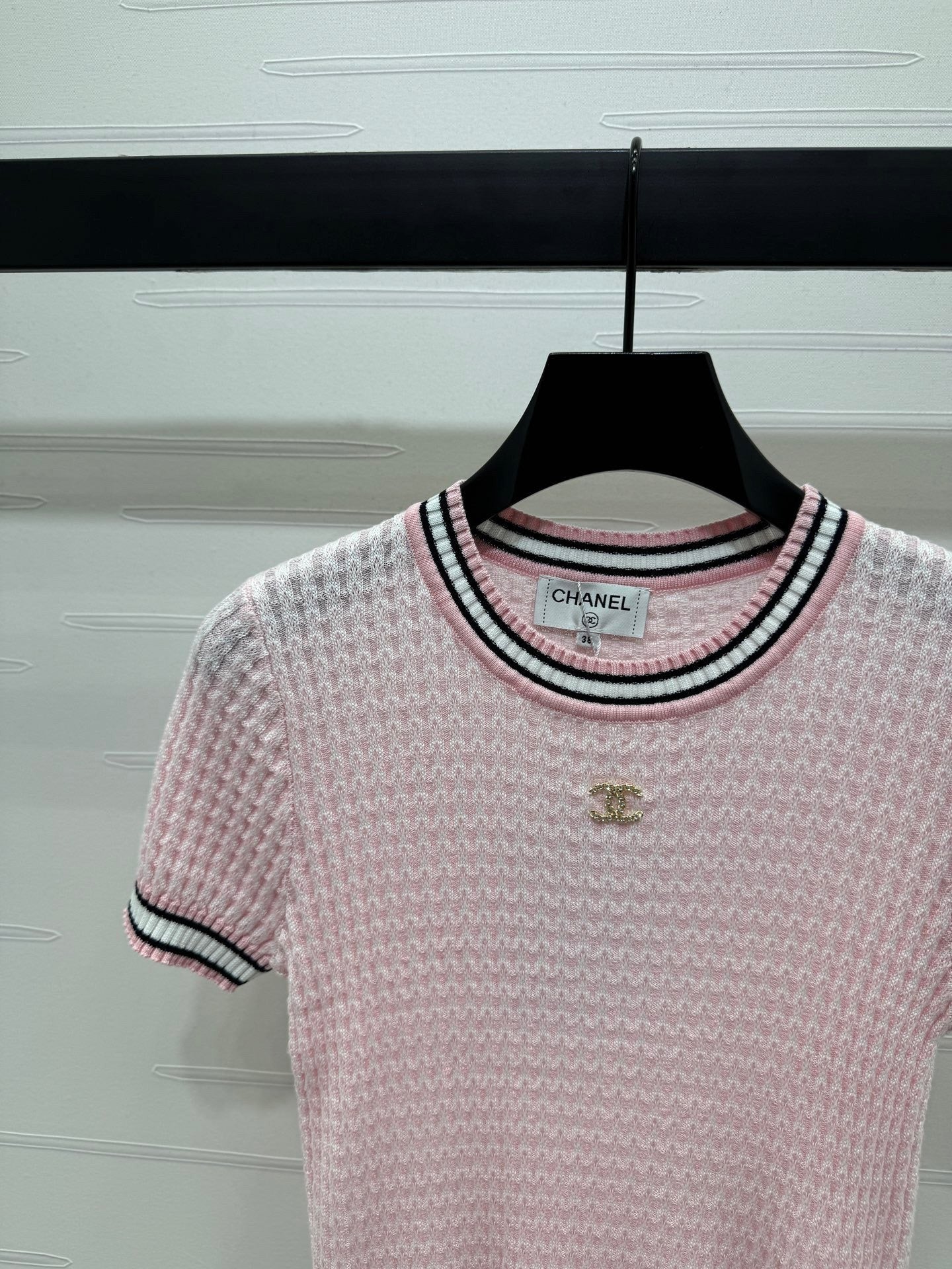 CHANE* 20250525, neueste Frühjahrs- und Sommerkollektion! Rundhalsausschnitt, schmal geschnitten, kurze Strickärmel! Individuell gestricktes Material, zarte Textur, weich und bequem. Rundhalsausschnitt, kurze Strickärmel sind am gesamten Körper mit Häkeltexturen geschnitten, um das gerippte Texturmuster hervorzuheben und das hochwertige Tragegefühl hervorzuheben. Kontrastierende Fadenbesätze an Halsausschnitt, Bündchen und Saum. Passt sich durch seine elastischen Eigenschaften der Körperform an und lässt Sie schlanker aussehen. Doppel-C-Logo-Verzierung auf der Brust verleiht einen exquisiten Ton. Zeigt den Markenton. Vielseitiger Stil wählt weder Alter noch Hautfarbe! 3️⃣ Farben! SML