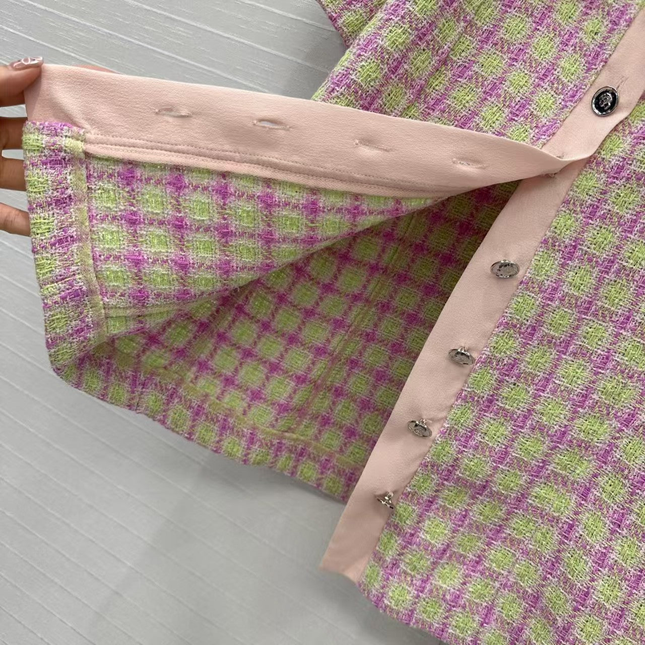 25er-Jahre-Neuheit! Das kurzärmelige Tweed-Oberteil im Chaebol-Tochter-Stil mit Seidenpuppenkragen hat ein zartes rosa-grünes Karomuster und wirkt süß und jugendlich. Die schmale Passform und der karierte Schnitt verleihen dem Oberkörper einen sanften und hochwertigen Look und können süß oder salzig sein! 100 % Seidenspleißung, perfekte Verarbeitung, Qualität im Detail.