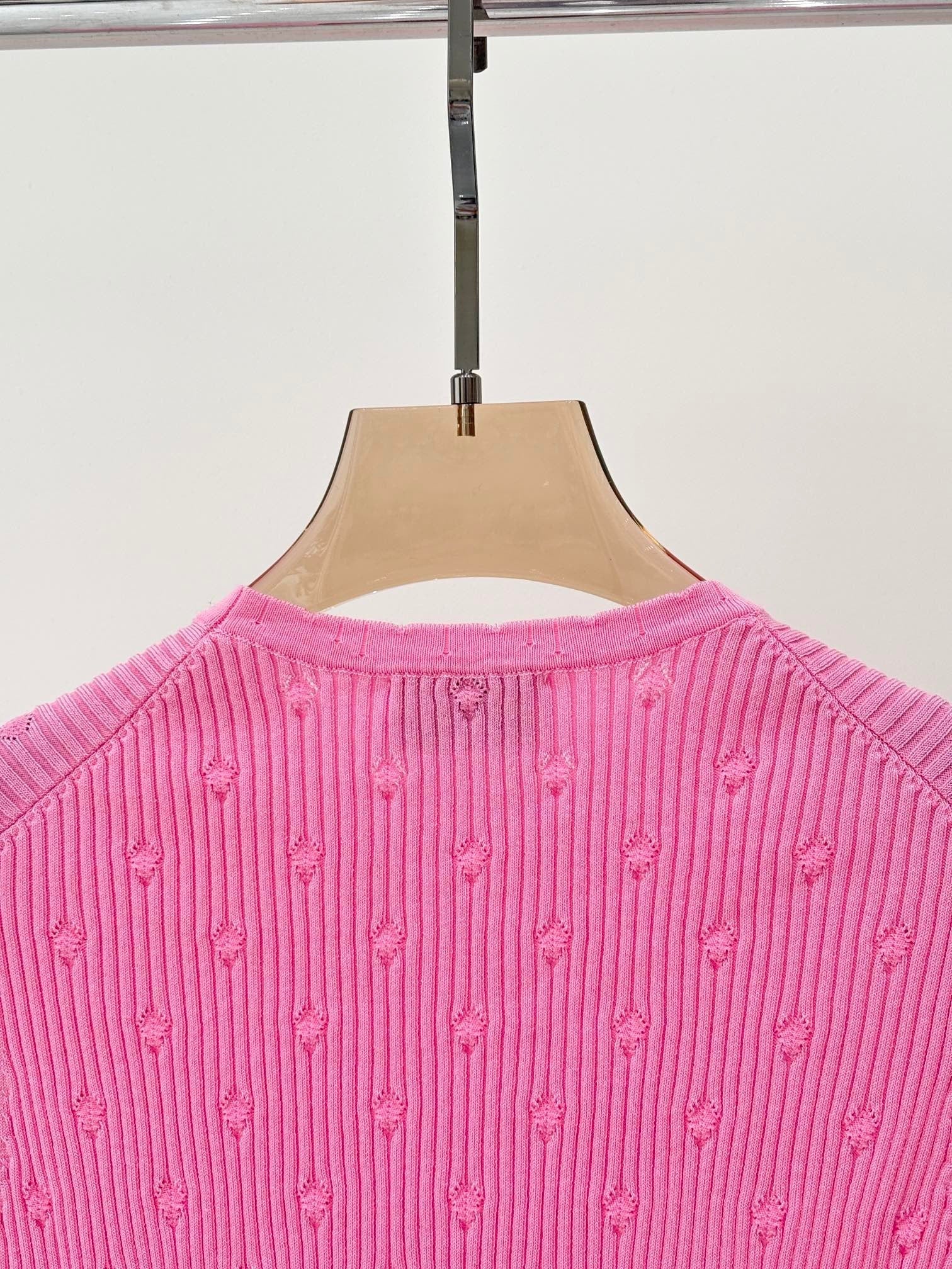 25 Sommer neuer Rundhalsausschnitt Buchstabenlogo hohler Jacquard einfacher schlanker Strick mit kurzen Ärmeln