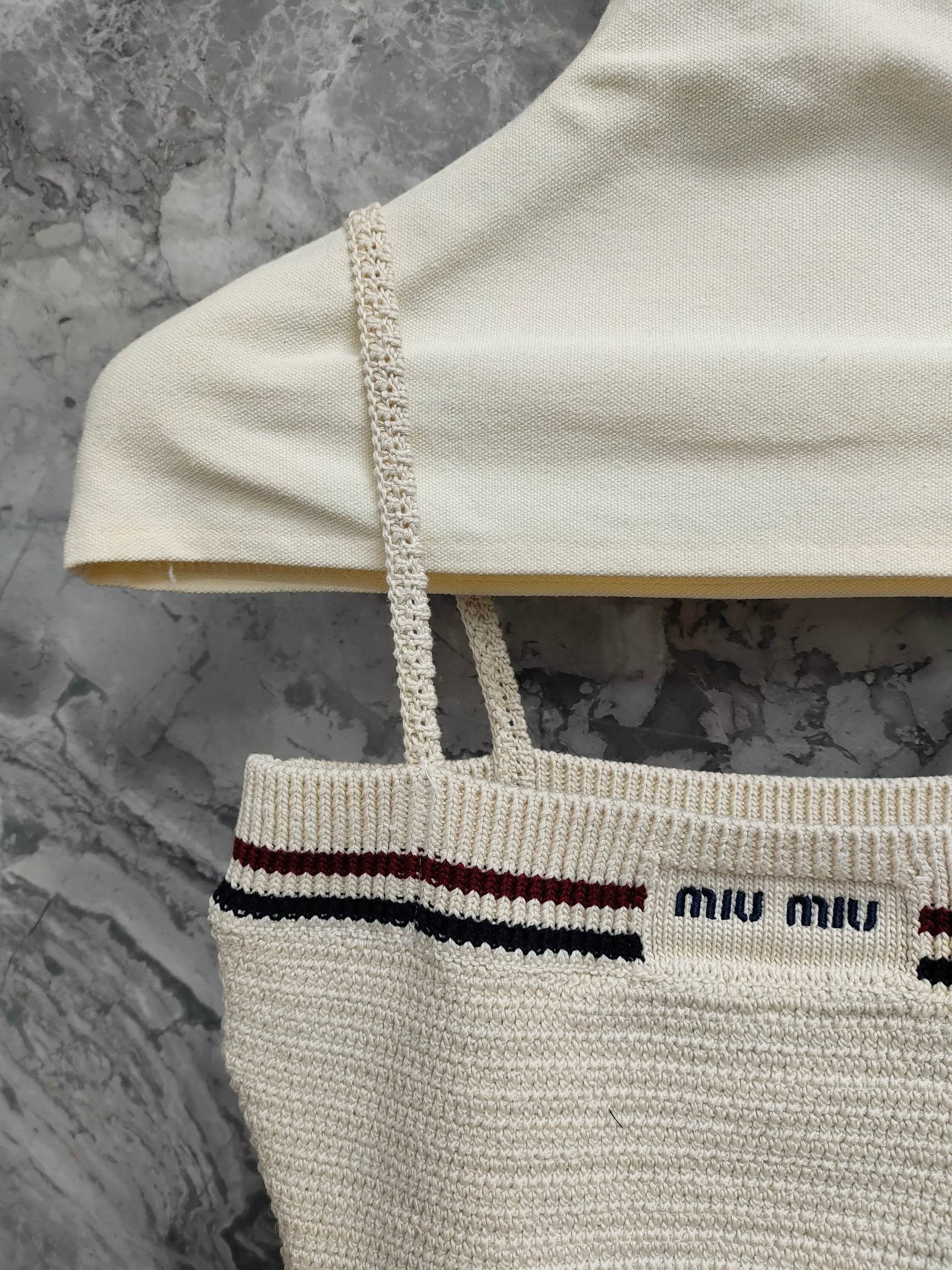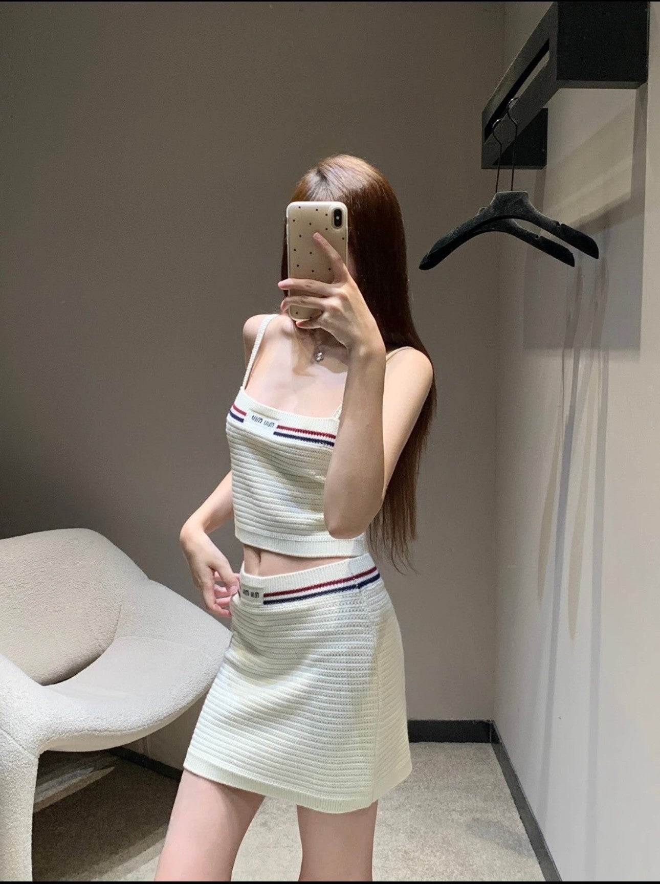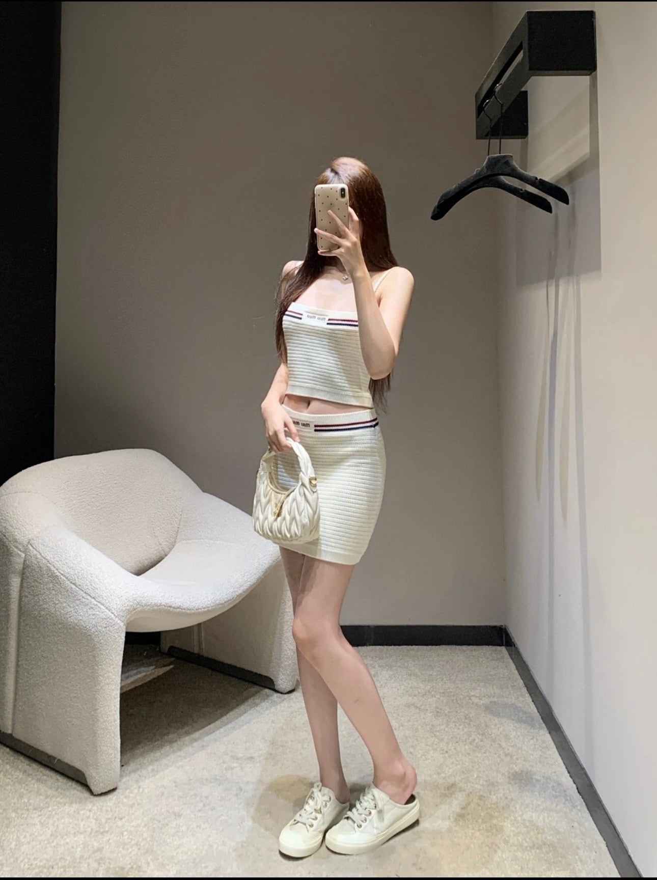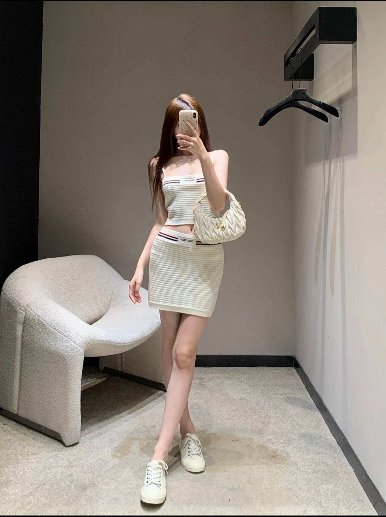 Dieses cremefarbene Strickset interpretiert sportliche Elemente mit femininer Finesse neu – ein kurzes Camisole (mit zarten Spaghettiträgern und einem klaren, geraden Ausschnitt) wird mit einem figurbetonten Minirock (der die Taille betont) kombiniert, beides verziert mit kräftigen Kontraststreifen und einem charakteristischen Logoband. Es ist ein Dialog zwischen sportlicher Energie und raffinierter Ausstrahlung, der die Regeln des lässig-schicken Outfits neu definiert.