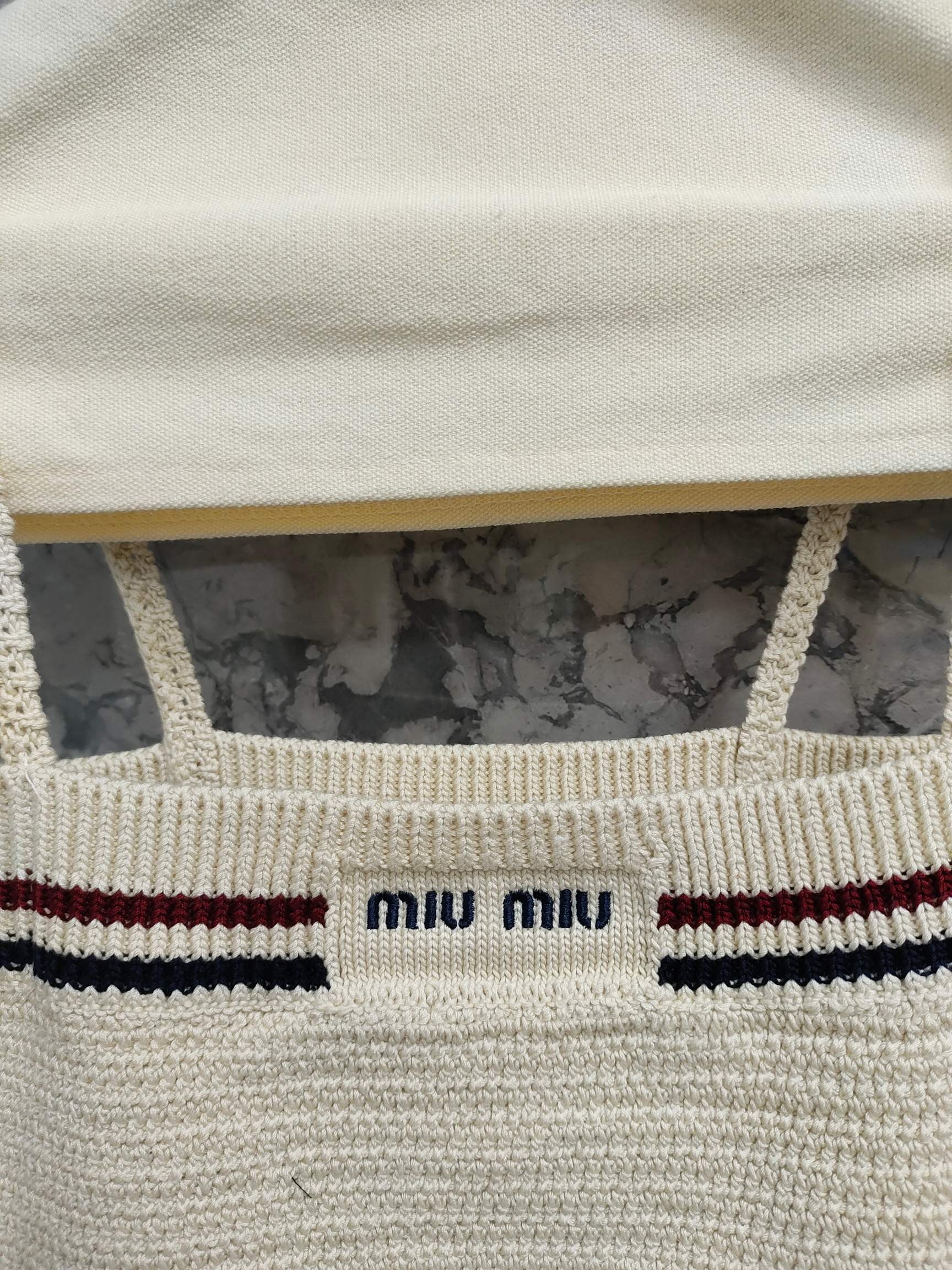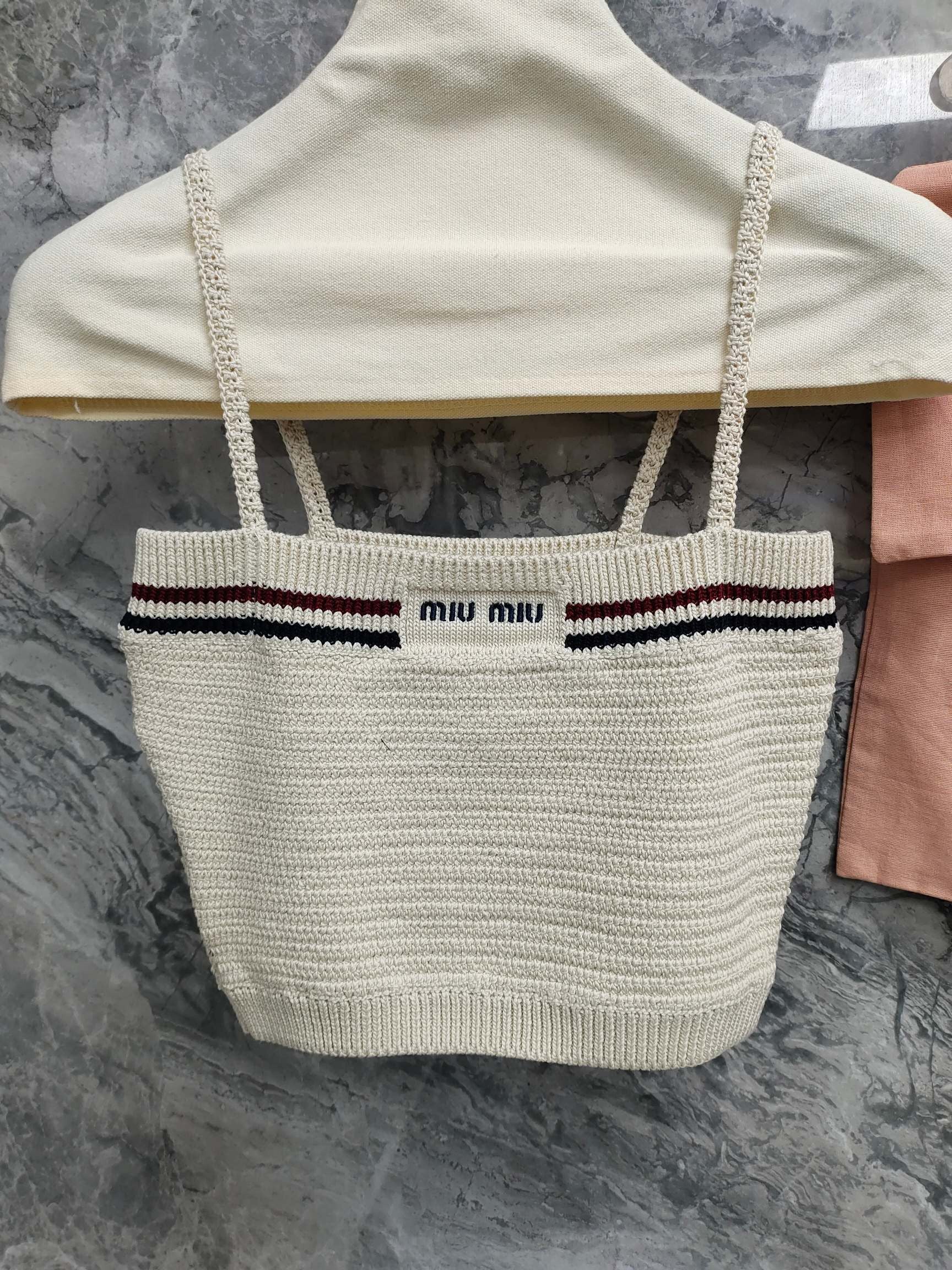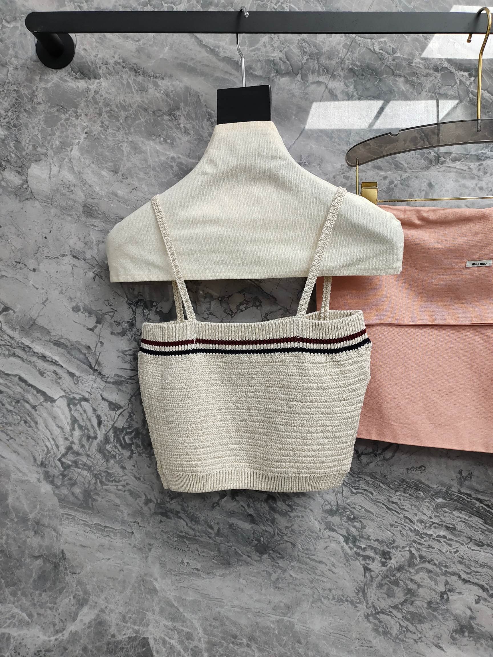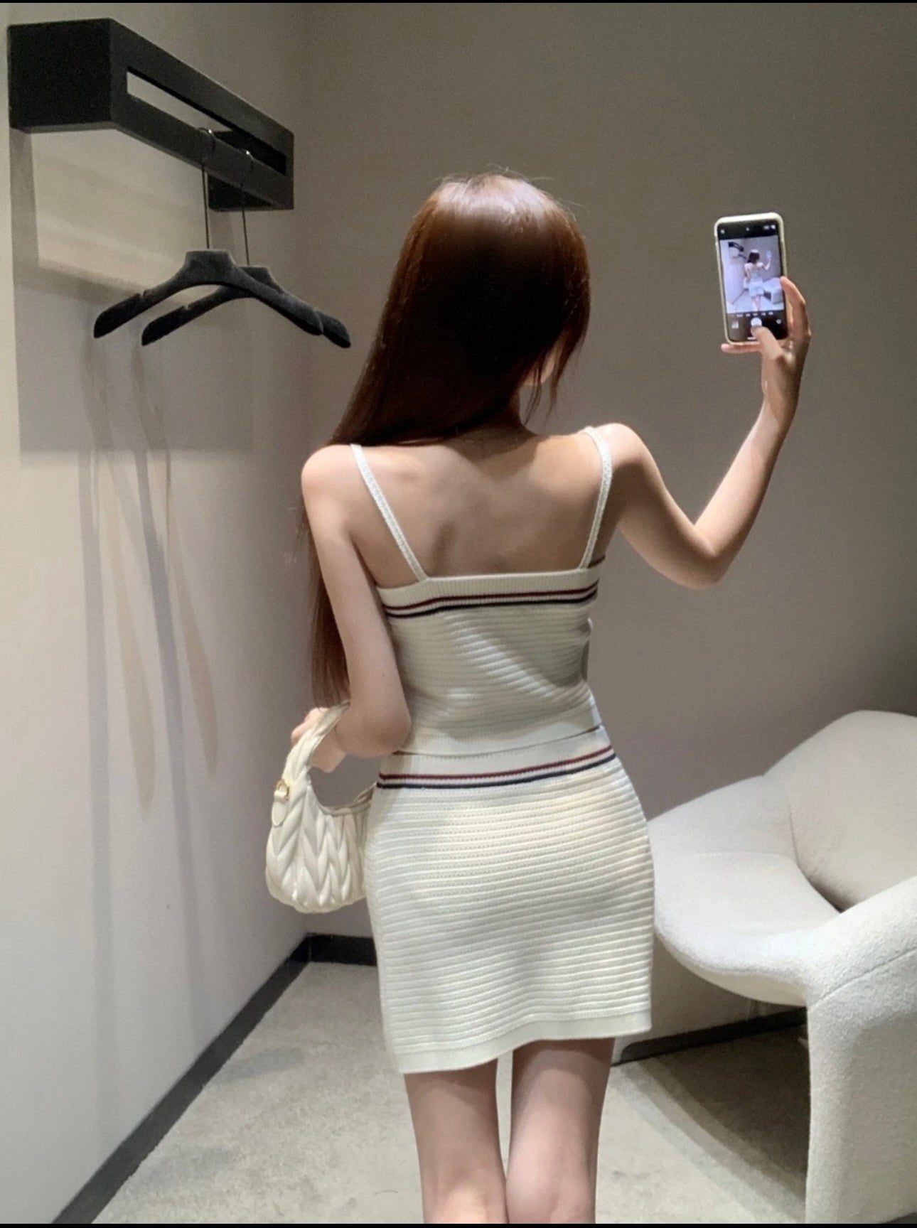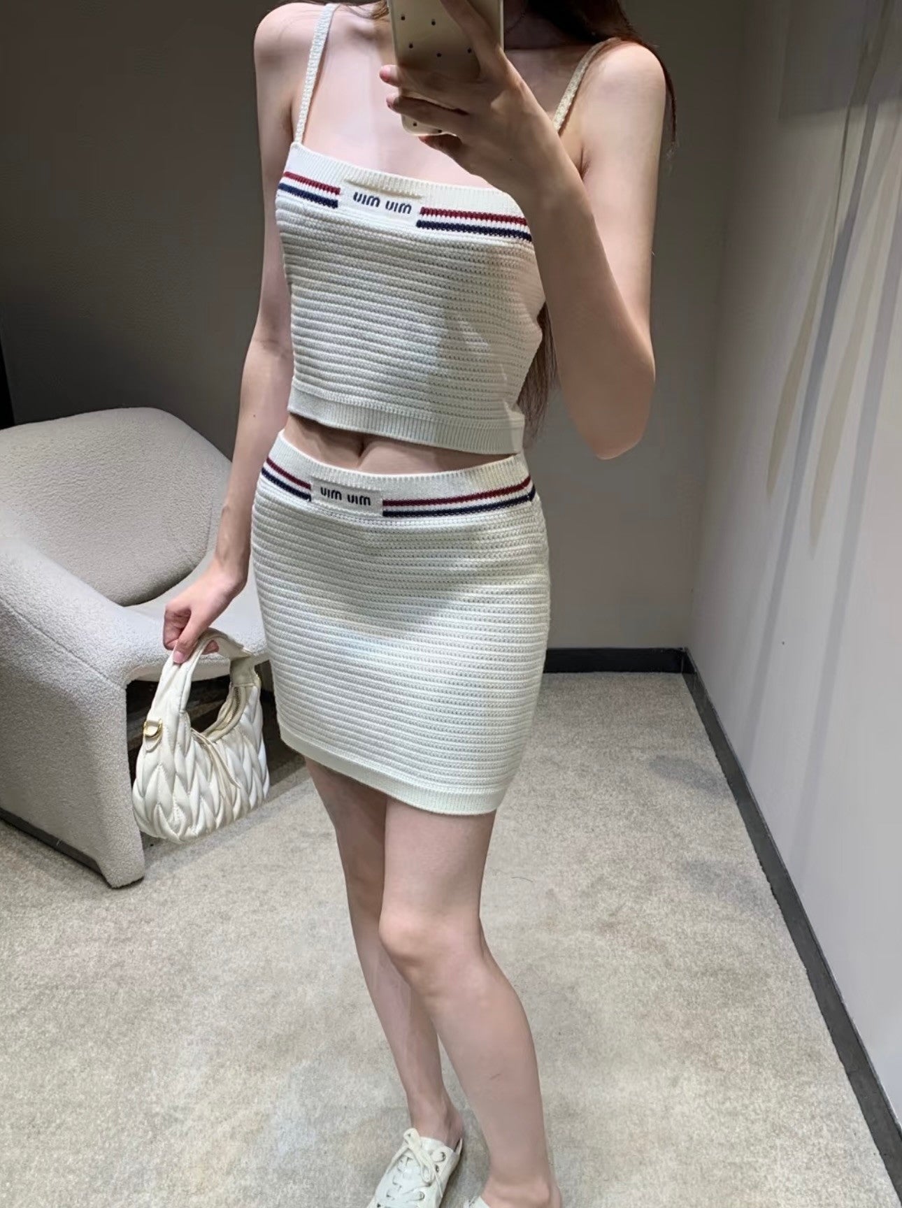 Dieses cremefarbene Strickset interpretiert sportliche Elemente mit femininer Finesse neu – ein kurzes Camisole (mit zarten Spaghettiträgern und einem klaren, geraden Ausschnitt) wird mit einem figurbetonten Minirock (der die Taille betont) kombiniert, beides verziert mit kräftigen Kontraststreifen und einem charakteristischen Logoband. Es ist ein Dialog zwischen sportlicher Energie und raffinierter Ausstrahlung, der die Regeln des lässig-schicken Outfits neu definiert.