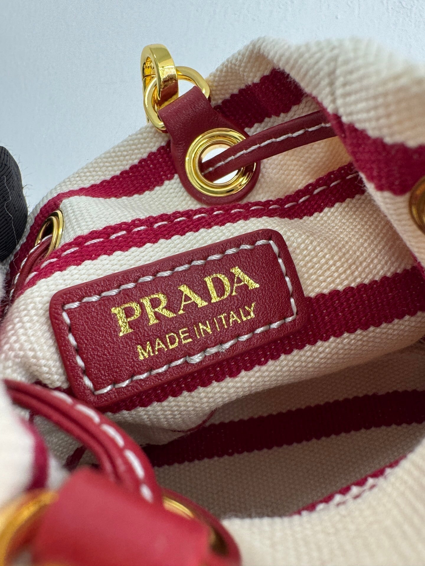 Lust auf eine Minitasche, die gleichermaßen verspielt und elegant ist? Diese gestreifte Mini-Beuteltasche aus Canvas hat es in sich: Retro-Streifen, luxuriöse Goldbeschläge und ein kompaktes Design, das insgeheim funktional ist (ja, Ihre wichtigsten Dinge finden darin Platz!).