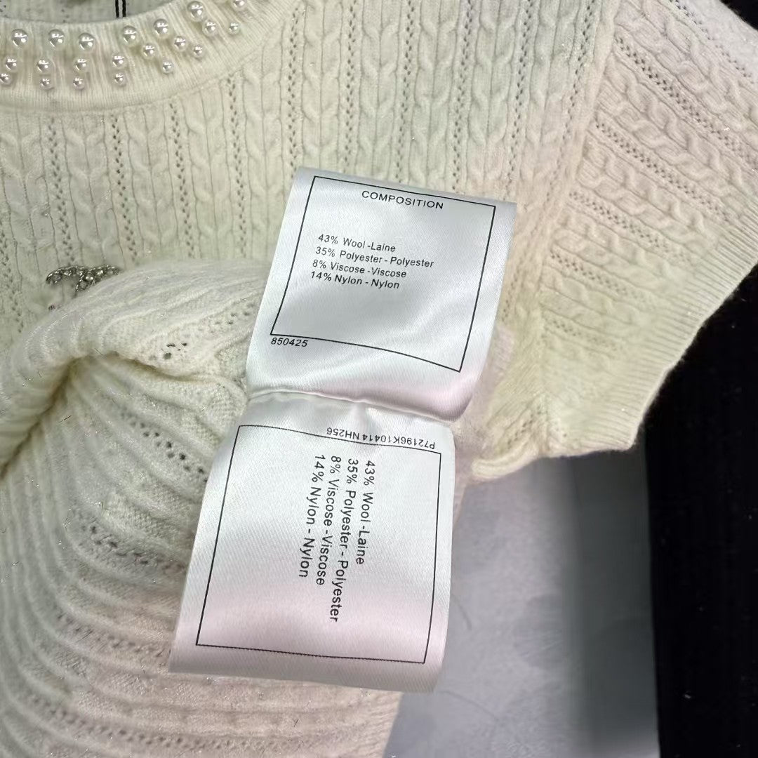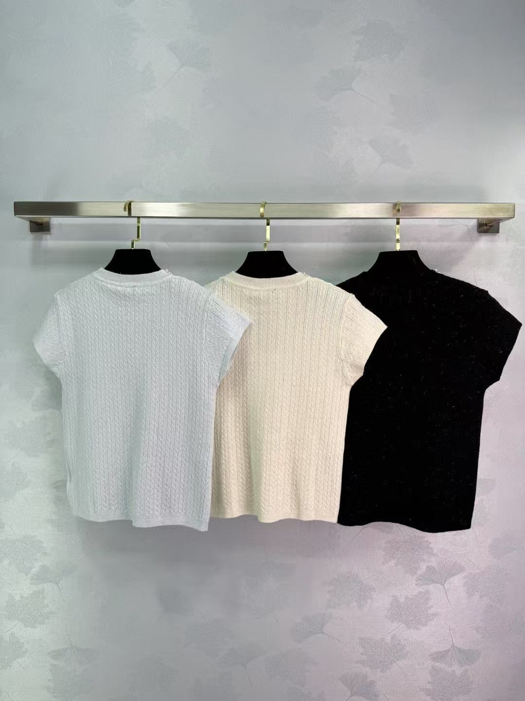Tissage sur mesure en fil de laine YB, élastique et confortable, à la texture riche. Ce haut à manches courtes souligne le style de la marque. Confectionné en laine élastique, il affine visuellement la silhouette. L'ensemble du vêtement présente une délicate texture torsadée verticale. Le col est orné de perles cousues, rehaussé de strass en forme de double C sur la poitrine pour des détails raffinés. Les détails du design transforment un basique simple en une pièce tendance. Le fil argenté intégré lui confère une esthétique sophistiquée. Porté seul ou superposé, il se distingue par son élégance. Disponible en 3 coloris.