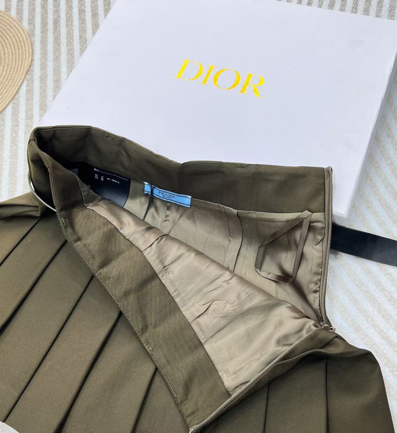 Jupe plissée vert kaki avec ceinture. Nouveauté pour le début du printemps. Une mini-jupe plissée classique au style décontracté et fonctionnel. Une mini-jupe plissée qui ajoute de nouveaux détails et du sens à une silhouette féminine. Cette mini-jupe en gabardine est dotée de poches à rabat boutonnées et d'une ceinture en cuir avec boucle gravée du logo. Un classique revisité. Polyvalente, elle est doublée et livrée avec une ceinture.