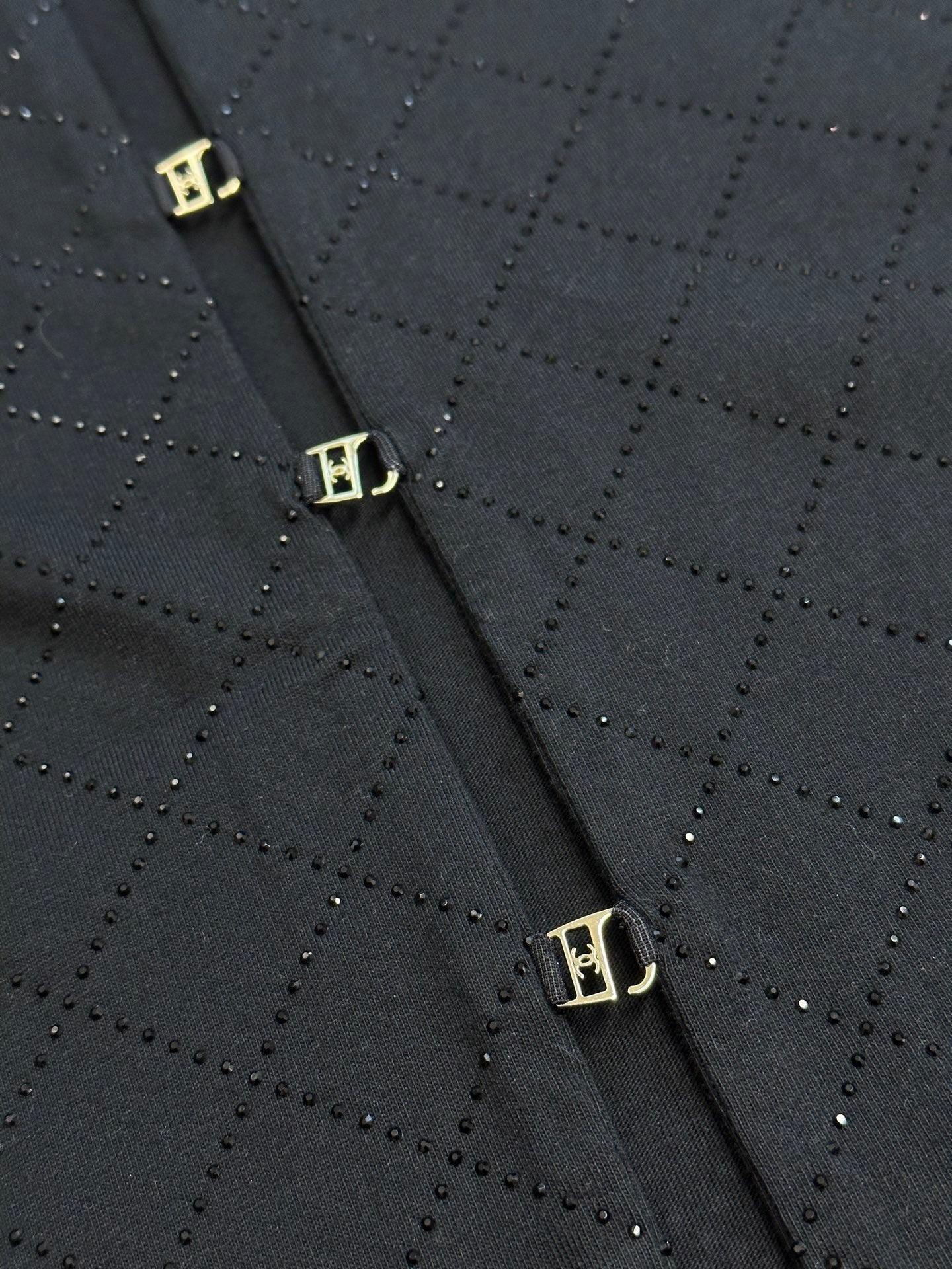 Ce t-shirt noir à col rond révolutionne le style décontracté : sa silhouette épurée et minimaliste est rythmée par un matelassage en strass scintillants (reprenant le motif diamant emblématique de la haute couture), tandis que les détails raffinés au dos lui confèrent une touche de rébellion. C'est la rencontre entre la simplicité du quotidien et l'allure de la nuit, redéfinissant le concept même du t-shirt.