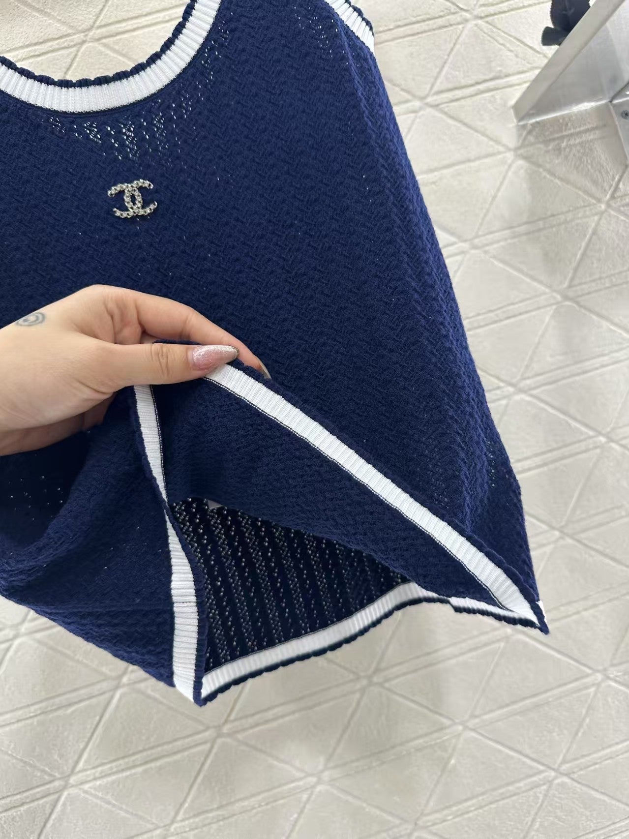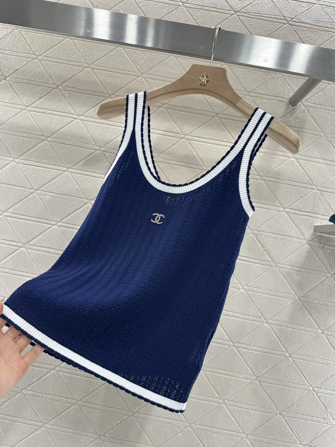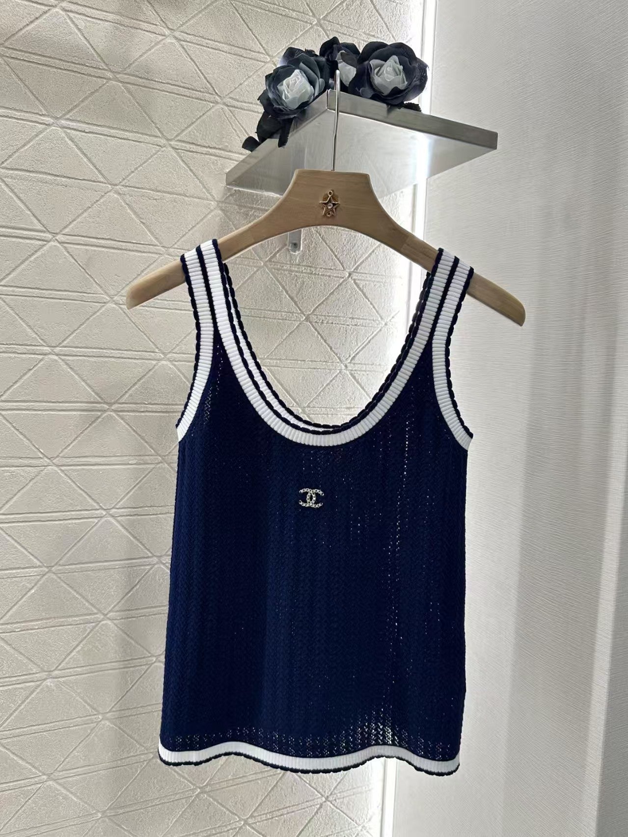 Tissage de fil de laine YB personnalisé, texture confortable et de haute qualité, coupe à bretelles, fond bleu roi sur toute la surface, bordure à rayures blanches sur l'ourlet du col, logo strass double lettre C sur la poitrine, soulignant la personnalité de la marque, soulignant le sens haut de gamme de l'usure, légèrement transparent et creux, rendant les styles simples sexy et individuels, élastiques et serrés pour plus d'exquis, amincissant, montrant un ton détendu, un luxe léger et un tempérament à la mode, peut être porté seul ou superposé, le premier choix pour les vêtements à la mode en toutes saisons