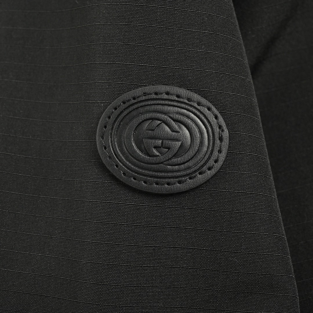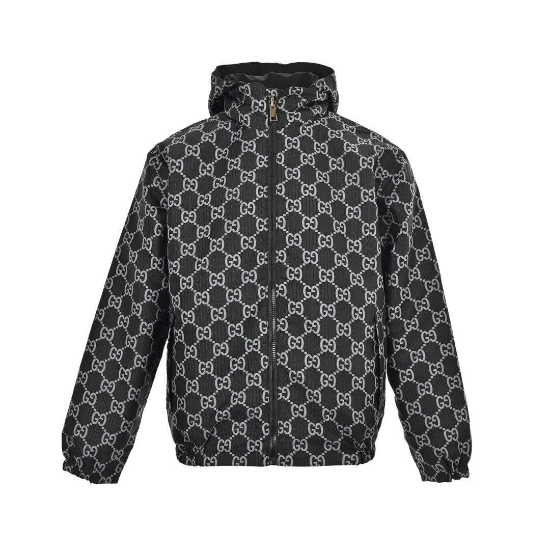 Cette veste réversible décontractée est confectionnée en nylon à carreaux noir et gris et comporte une capuche dissimulée et des patchs en cuir.