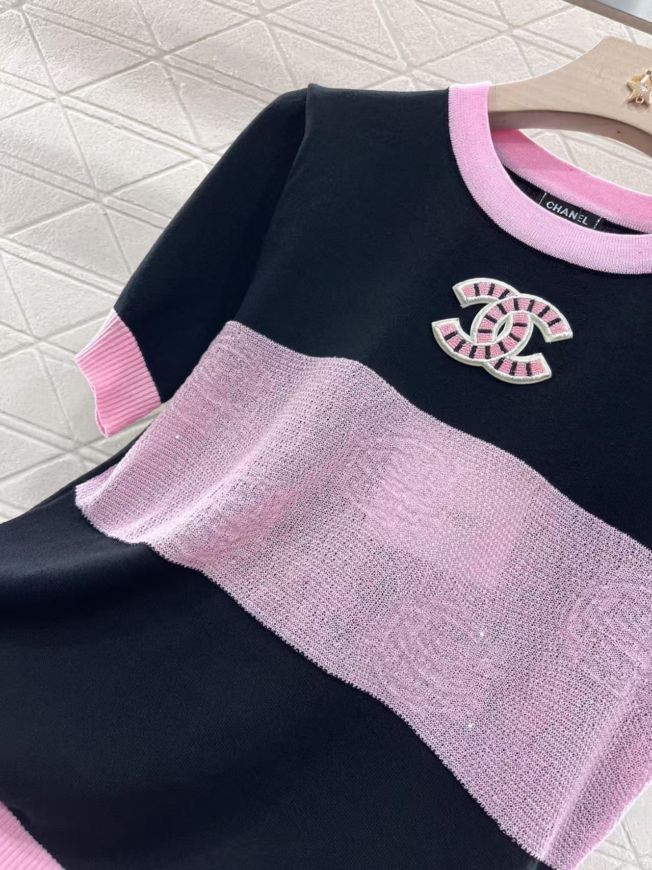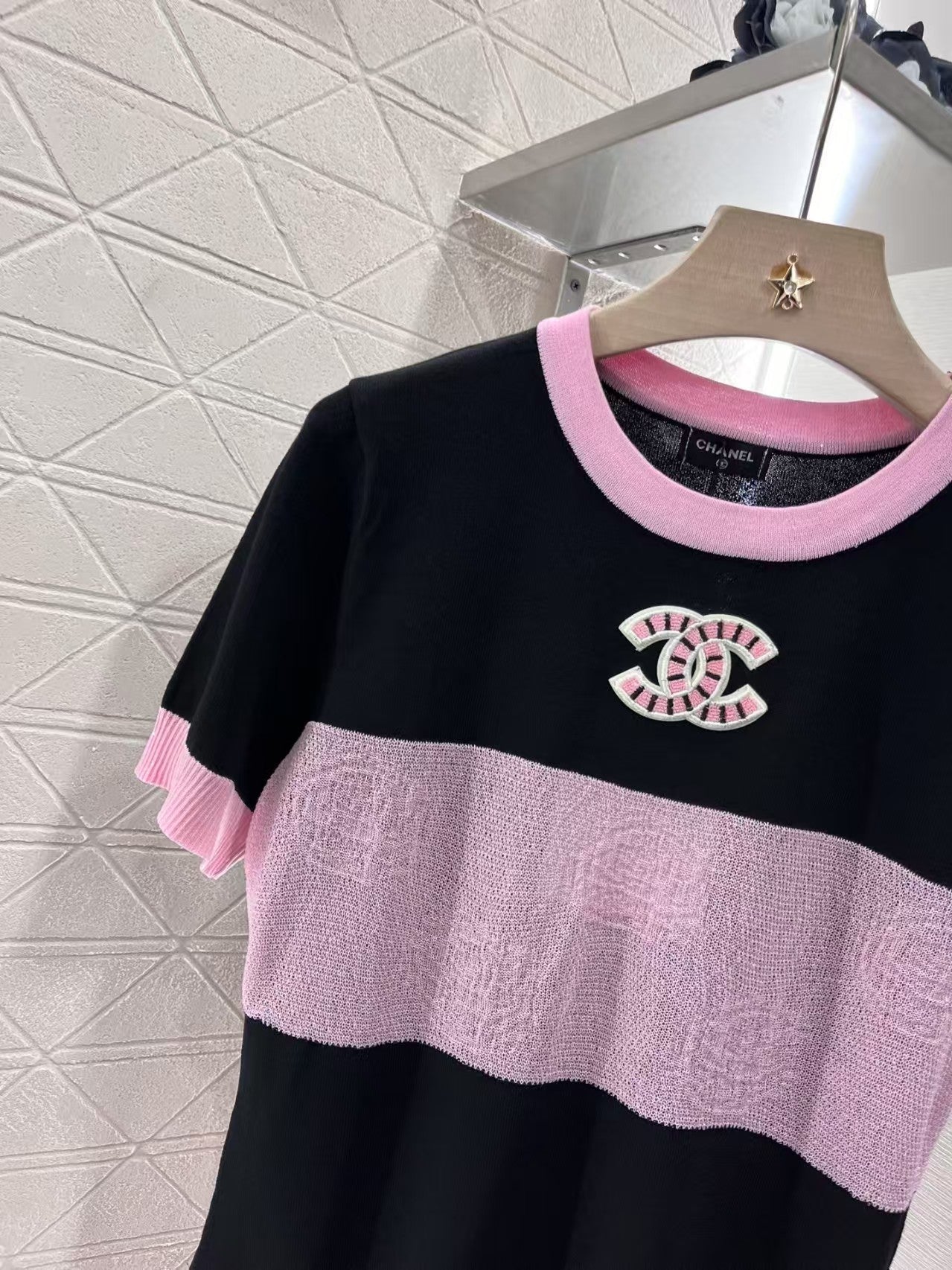 Manches courtes à rayures contrastées Motif de haut à manches courtes tricoté en fil Tencel YB personnalisé Entrelacement rose et noir Couleur fixe et processus de teinture Restaure parfaitement l'apparence Doux et agréable pour la peau Confortable et élégant L'encolure ronde expose convenablement la peau Embellit le rapport tête-épaules et vous fait paraître plus mince Logo double C sur la poitrine + décoration au crochet camélia Style de luxe fort La version élastique met en valeur la silhouette Blanchiment ludique et anti-âge Facile à contrôler pour les voyages quotidiens ou les rassemblements faciles