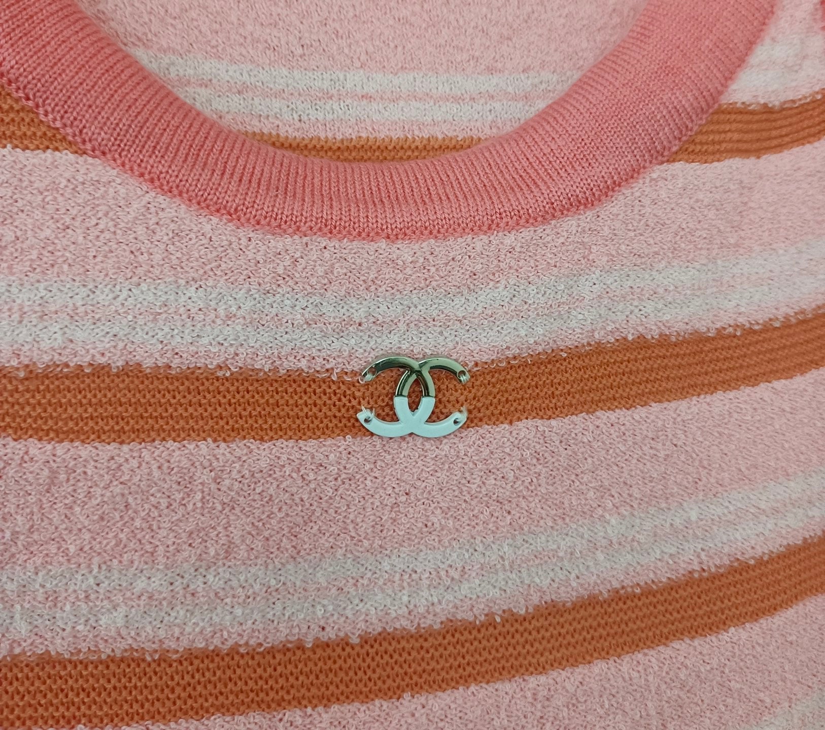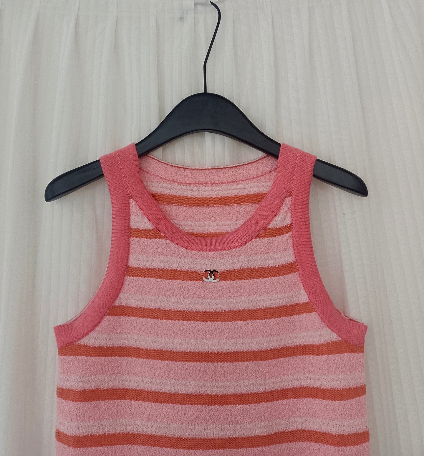 Ce débardeur court revisite le confort décontracté avec un raffinement ludique : le tissu éponge moelleux forme une toile de rayures rose bonbon et corail, interrompue par un petit emblème métallique qui ajoute une touche couture raffinée. Sa silhouette courte et ajustée équilibre le volume doux du tissu avec une sensualité subtile, créant un dialogue entre aisance décontractée et élégance discrète.