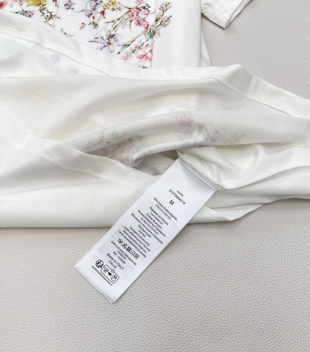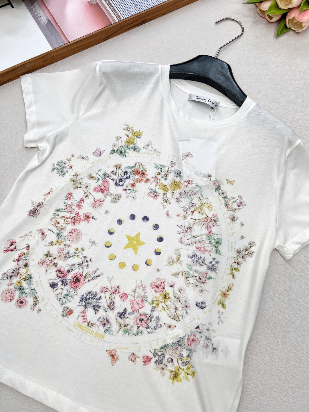 New for early fall, this floral, five-pointed star print crewneck short-sleeve top features a yb exclusive! High-quality, high-top quality! The main body is adorned with natural elements like flowers, vines, and the changing phases of the moon, forming a spiral pattern. A five-pointed star punctuates the center, perfectly embellishing the brand's signature aesthetic. The ethereal style unifies and harmonizes, maximizing the design. Made from 100% cotton, this top maintains a crisp, comfortable fit. Pair it with high-waisted bottoms or layer it for a laid-back, French-chic look.