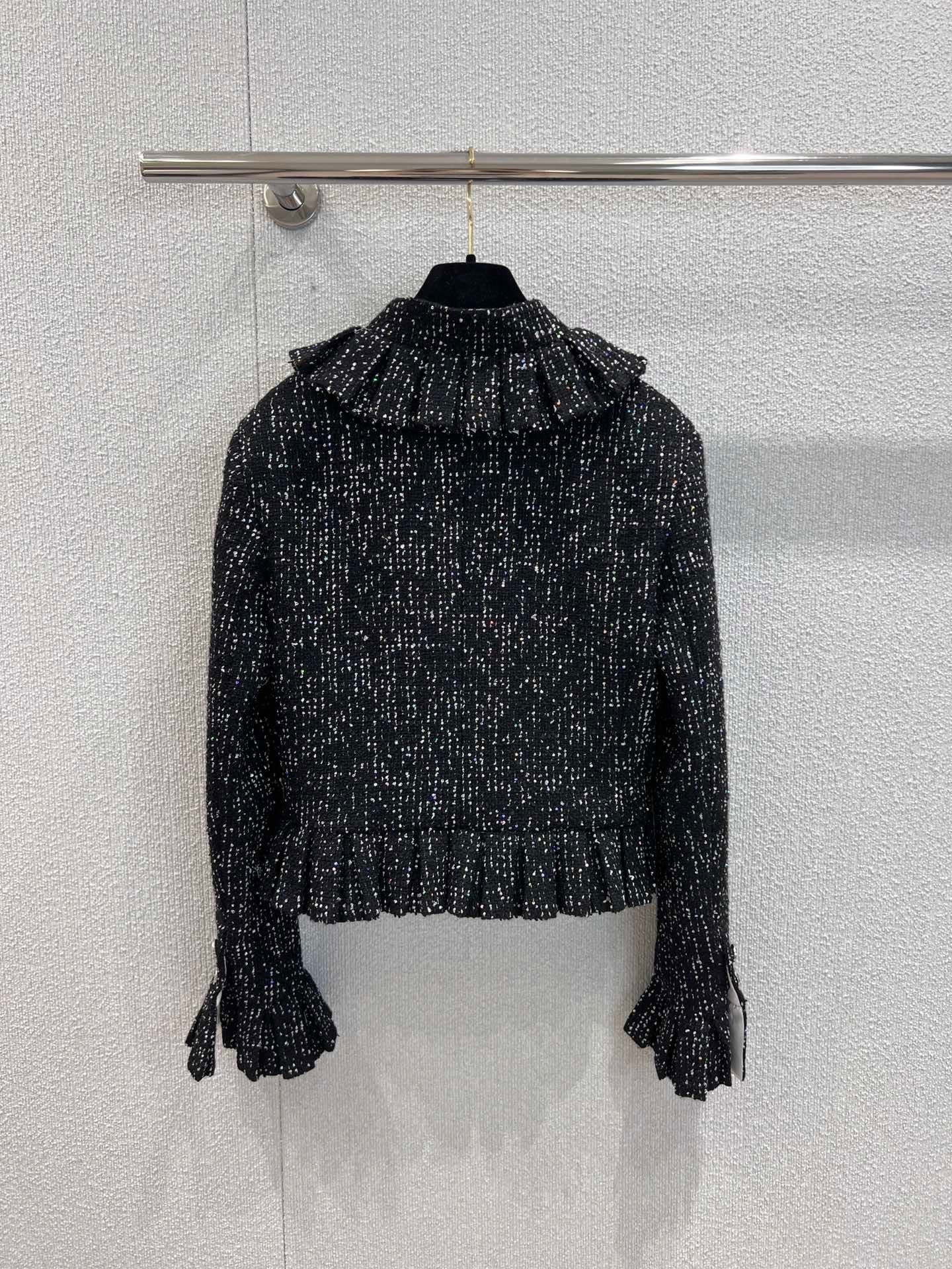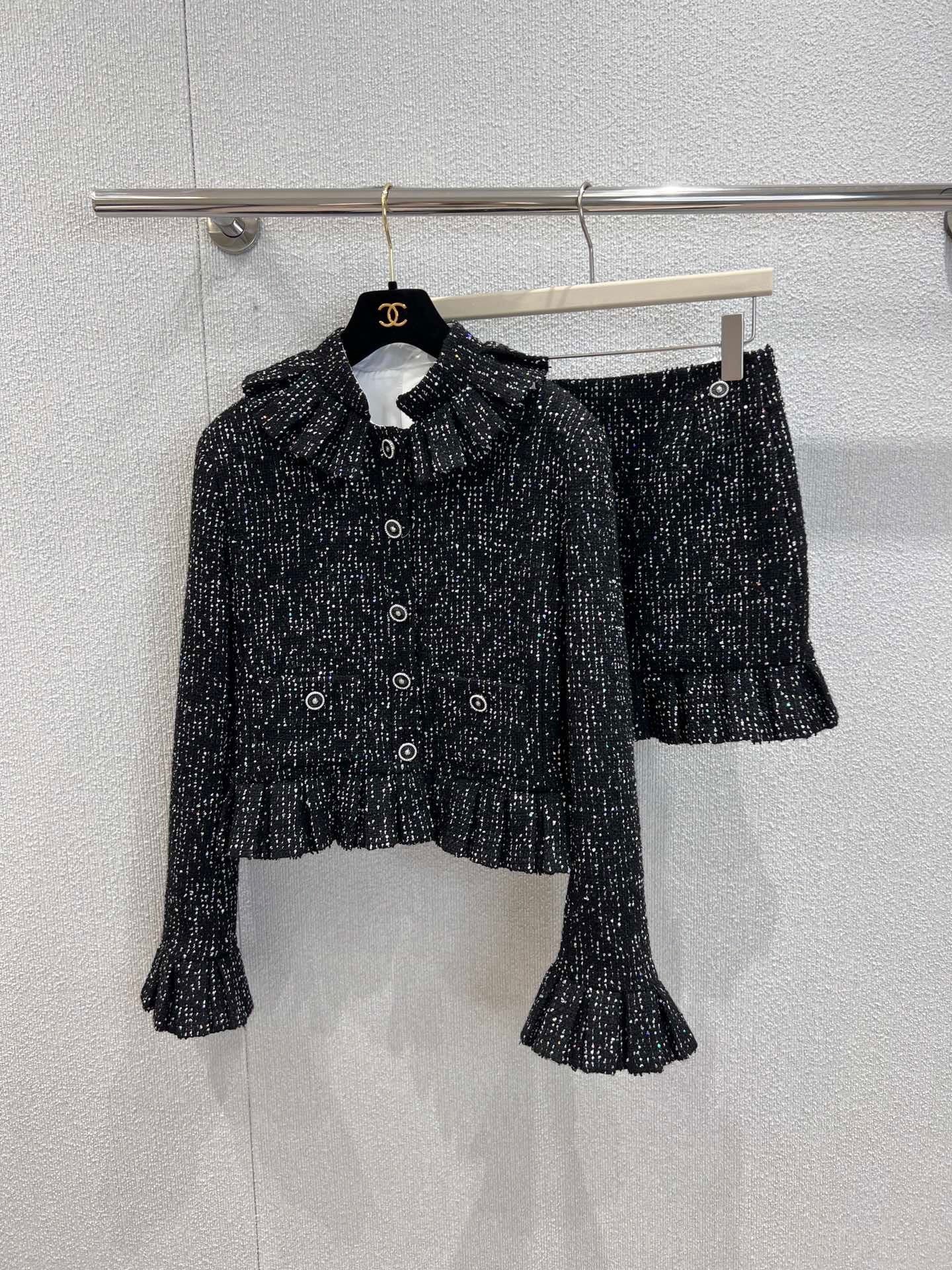 New model from the Haute Couture collection: a French palace-style sequined ruffled jacket and skirt! Made in high-end custom tweed fabric, with a custom-made, age-reducing ruffled lapel design, sequin embellishments, a high-waisted skirt, and pleated hem for a super leg-lengthening look. This set is incredibly high-end with stunning details.