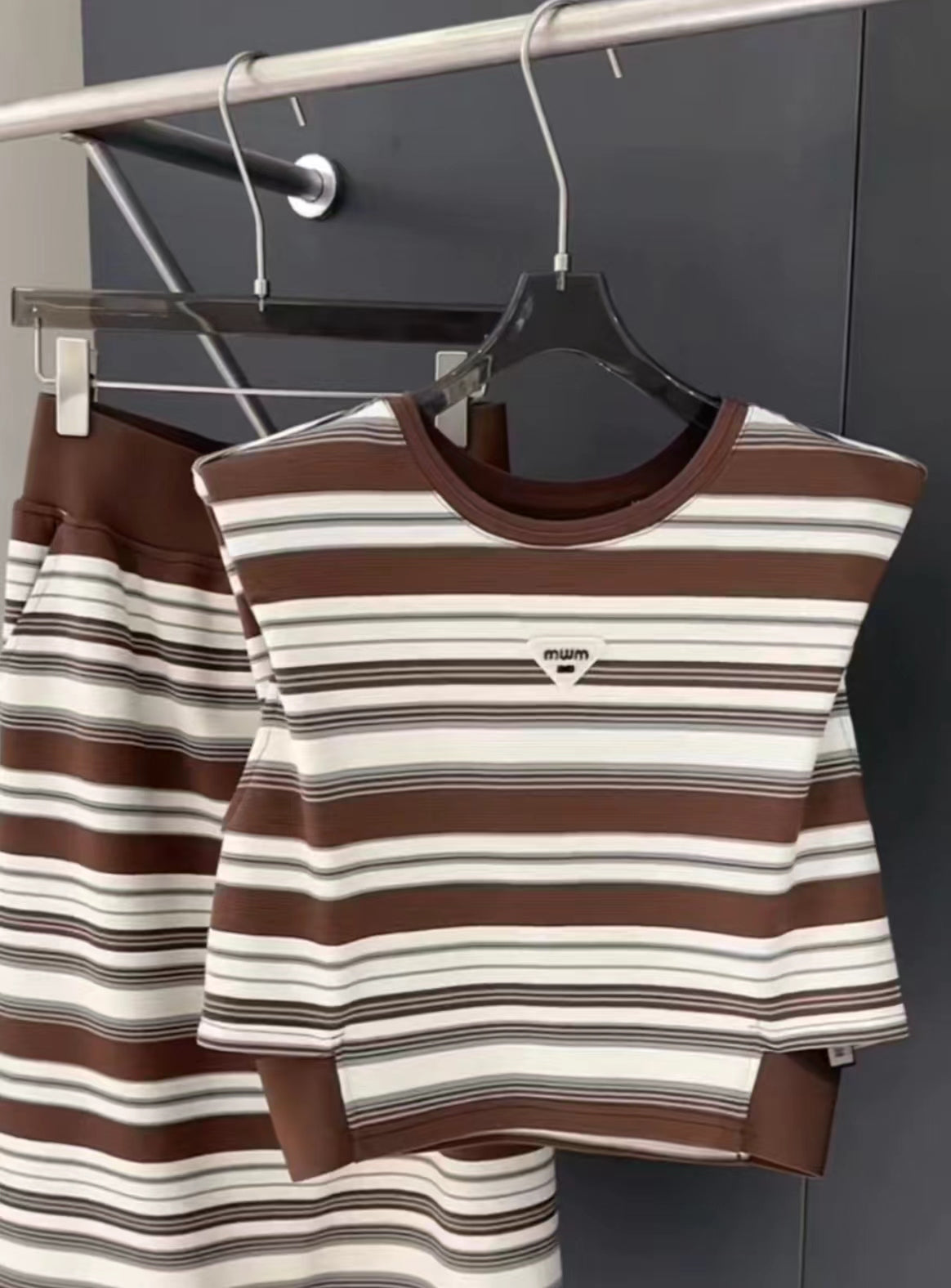 MM new striped knitted shoulder-less vest plus stitch skirt suit