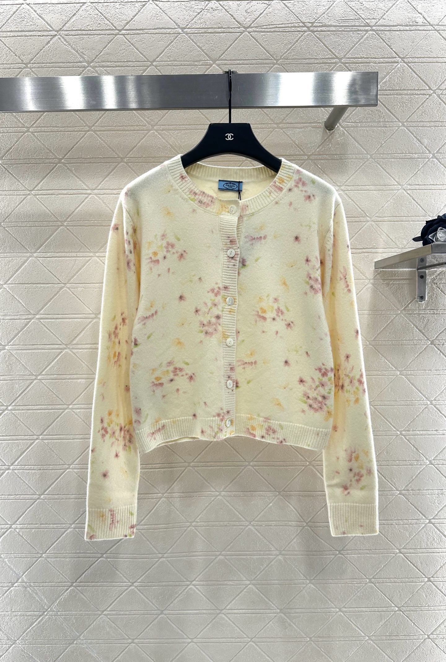 Custom-made from YB wool and mohair yarns, this cardigan offers a luxurious, comfortable, and soft feel. The round neckline and straight shoulders create a regular cut for a gentle, elegant look. The hems are finished with elastic. The vibrant, light yellow base is accented with a pink floral pattern, creating a sophisticated look. The regular fit is versatile, suitable for any figure or age, creating a sweet, youthful look.