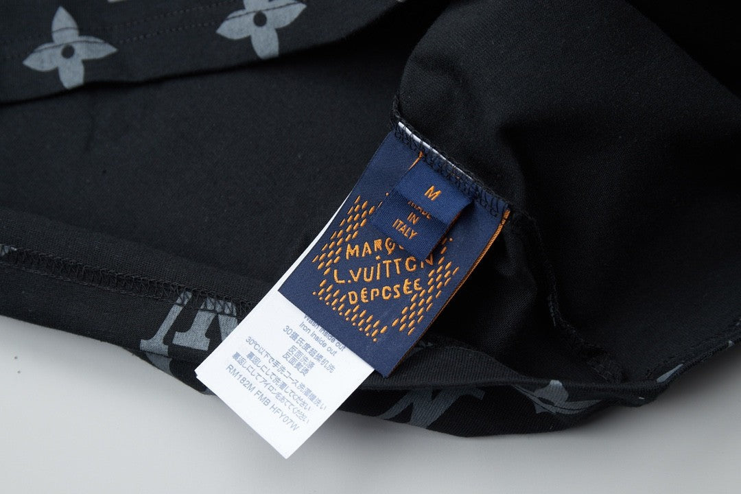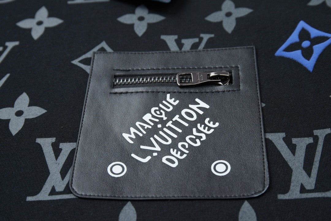 This black T - shirt is covered with a classic monogram pattern, and there are colorful letters and decorations dotted around, which gives it a really stylish look. There's a small pocket on the chest, adding a nice detail. The fabric looks soft, so it should be comfortable to wear.
