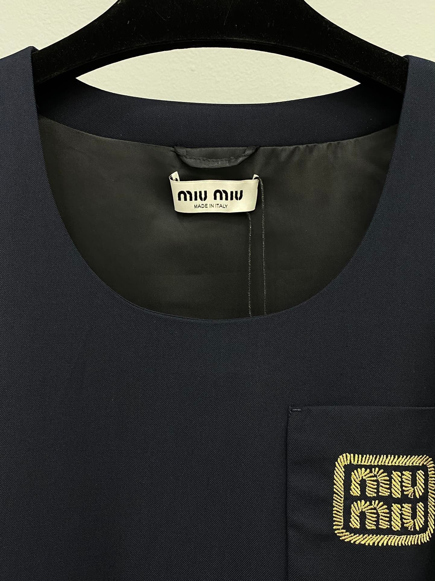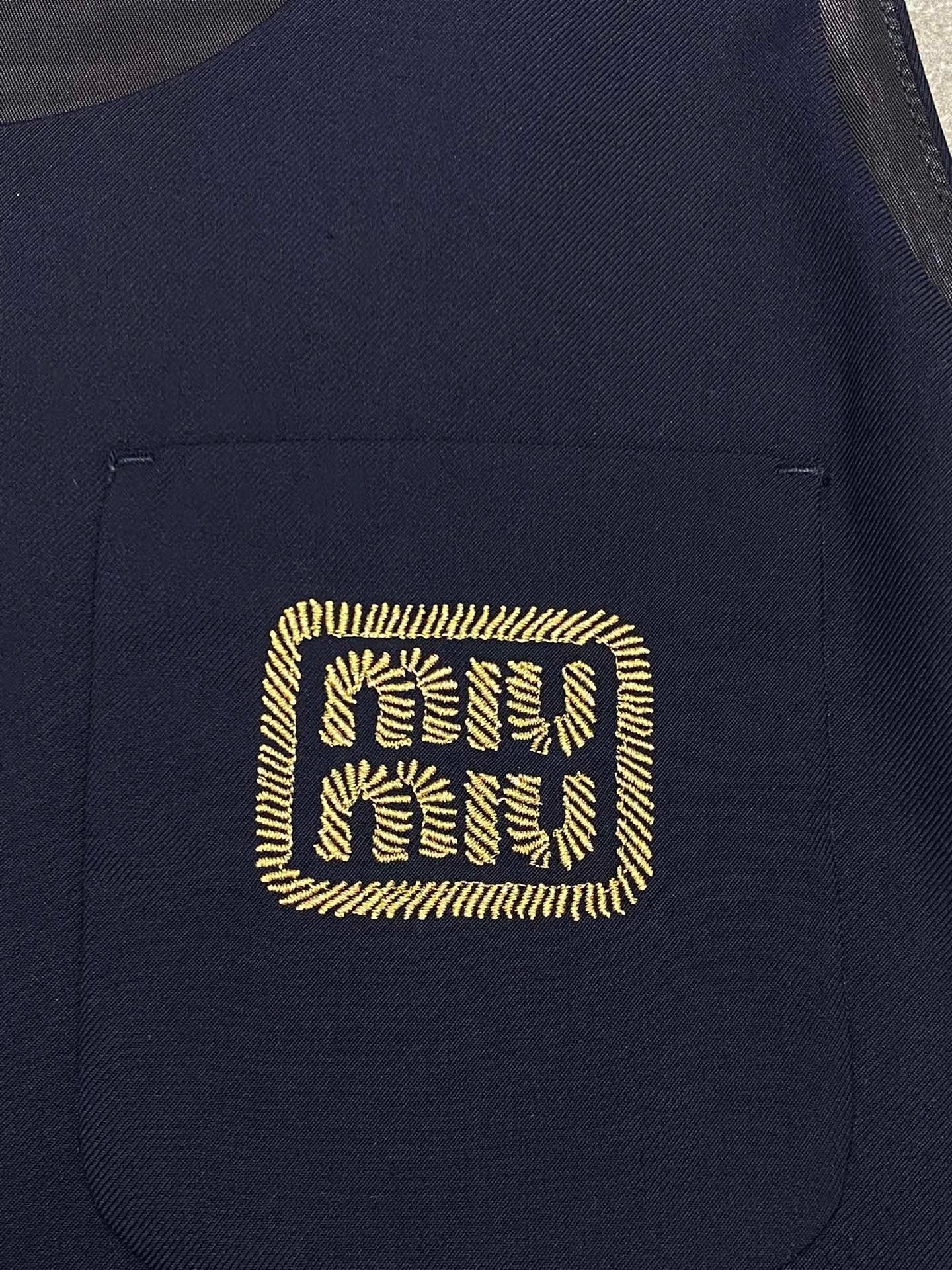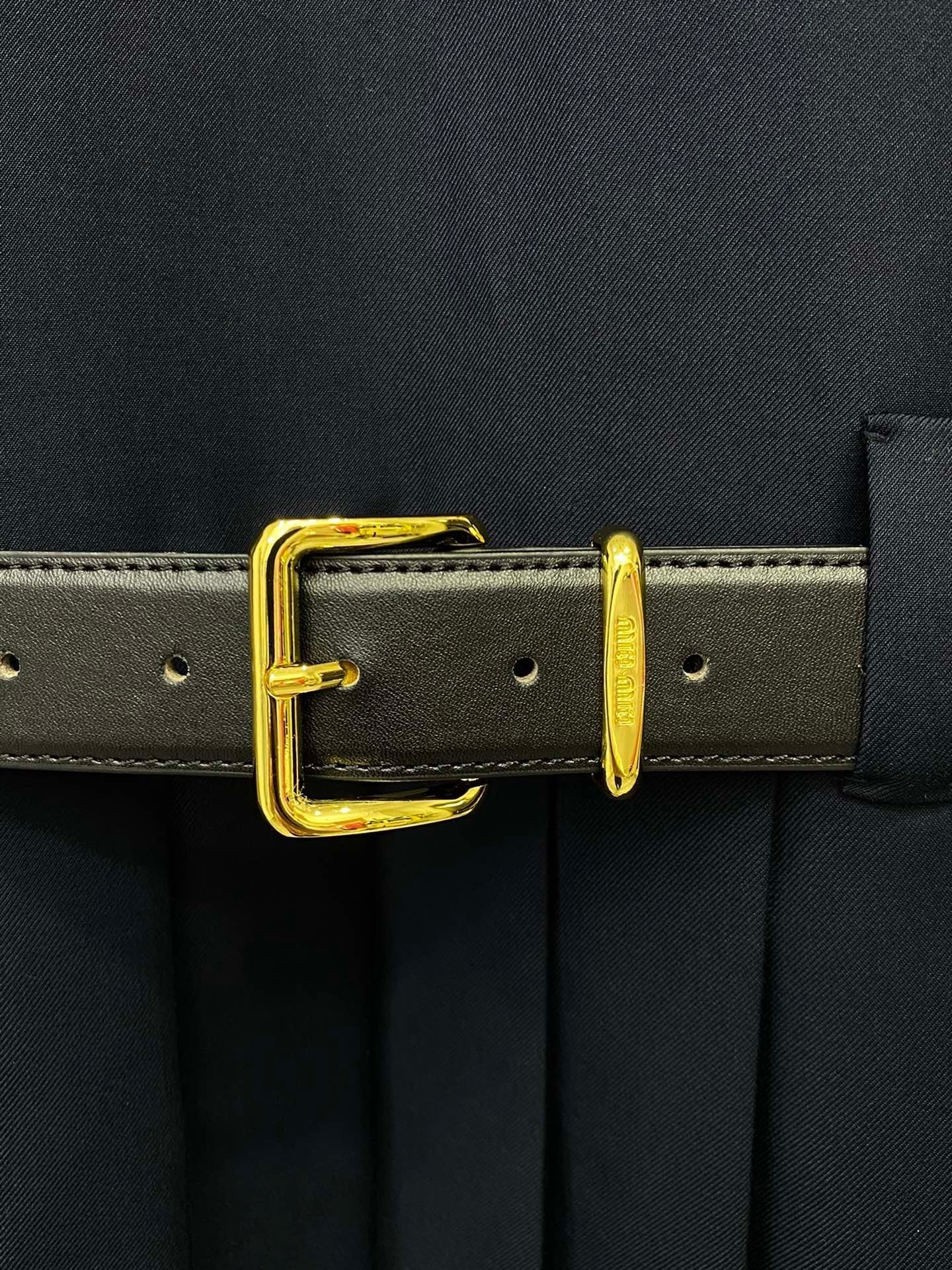 This navy blue sleeveless dress looks stylish and neat. It has a small pocket on the chest with a gold embroidered logo. The black belt with a shiny gold buckle cinches the waist, giving it a flattering shape. The skirt is pleated, so it flows nicely when you move.
